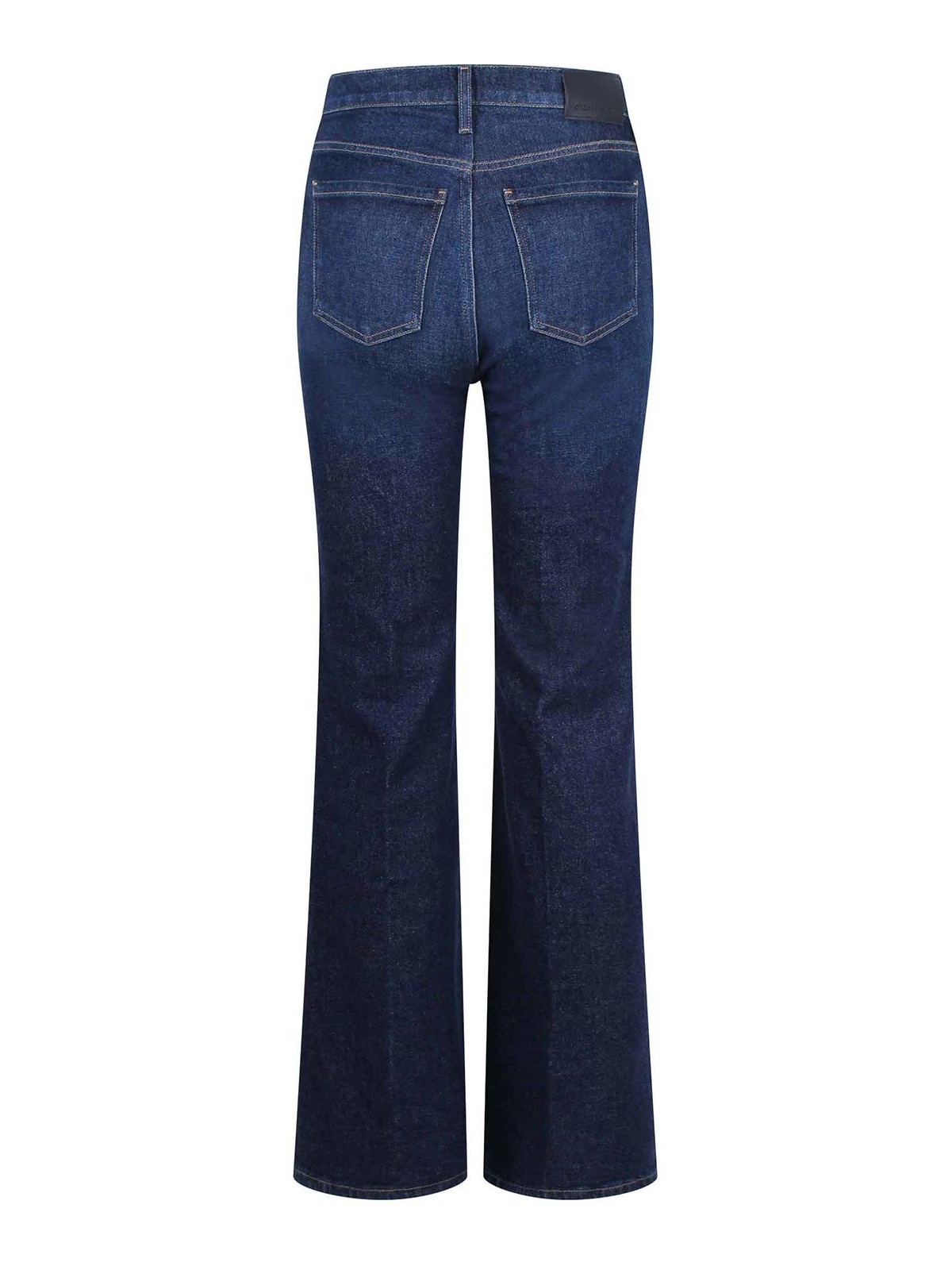 Kimberly Jeans' Flare of Citizens of Humanity Silhouette, die die Jahre inspiriert, für einen Vintage-Look und einen cleanen High-Life-Look, ausgestellte Taschen mit Knopf und Reißverschluss, Passanten für Veneneffekt, Gürtel und dunkler Farbton