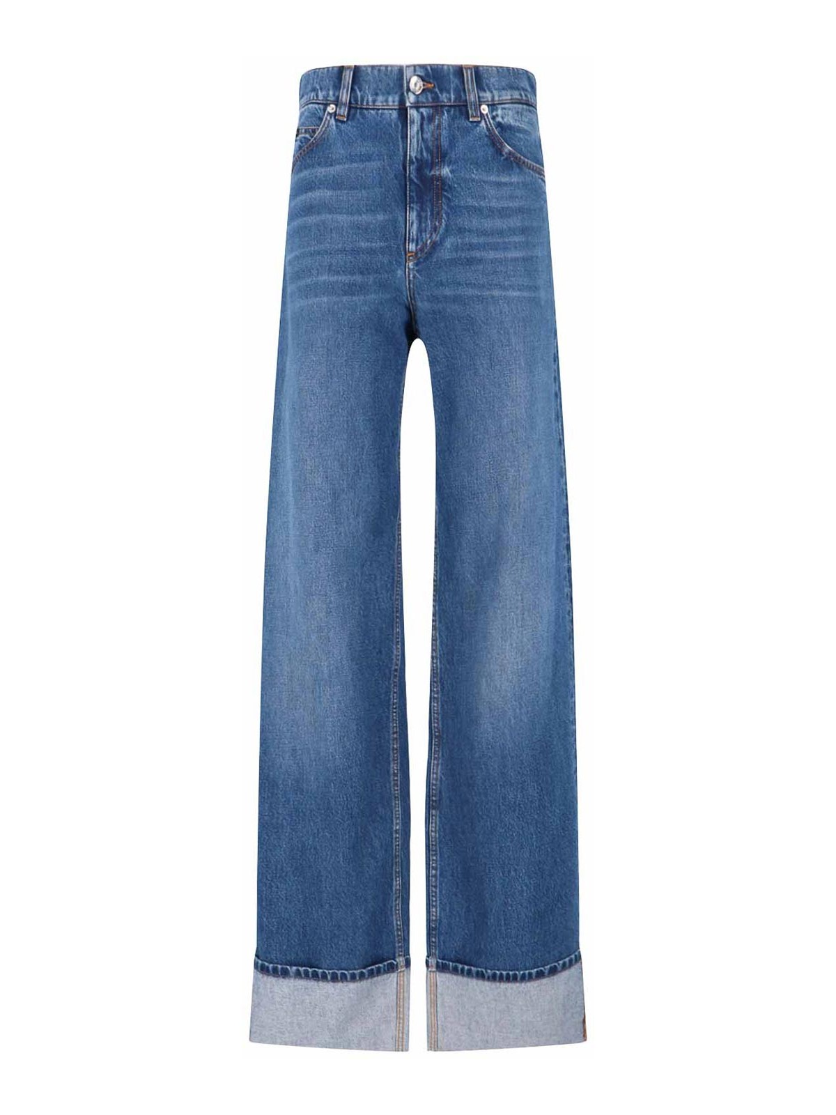 Dolce&Gabanna Jeans mit Bündchen, aus blauer Baumwolle, abgenutzte Waschung, hohe Taille, Gürtelschlaufen, Knopf- und Reißverschluss, Fünf-Taschen-Design, Logo-Etikett auf der Vorderseite, silberne Logoplatte hinten, Manschette am Saum, gerades Bein.