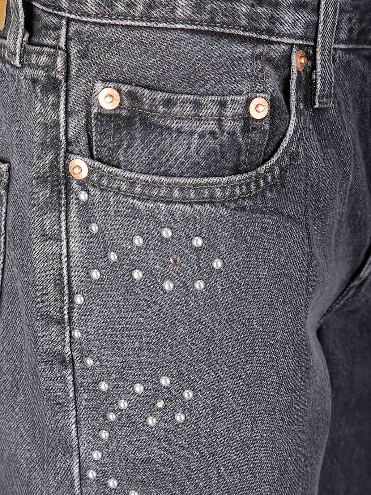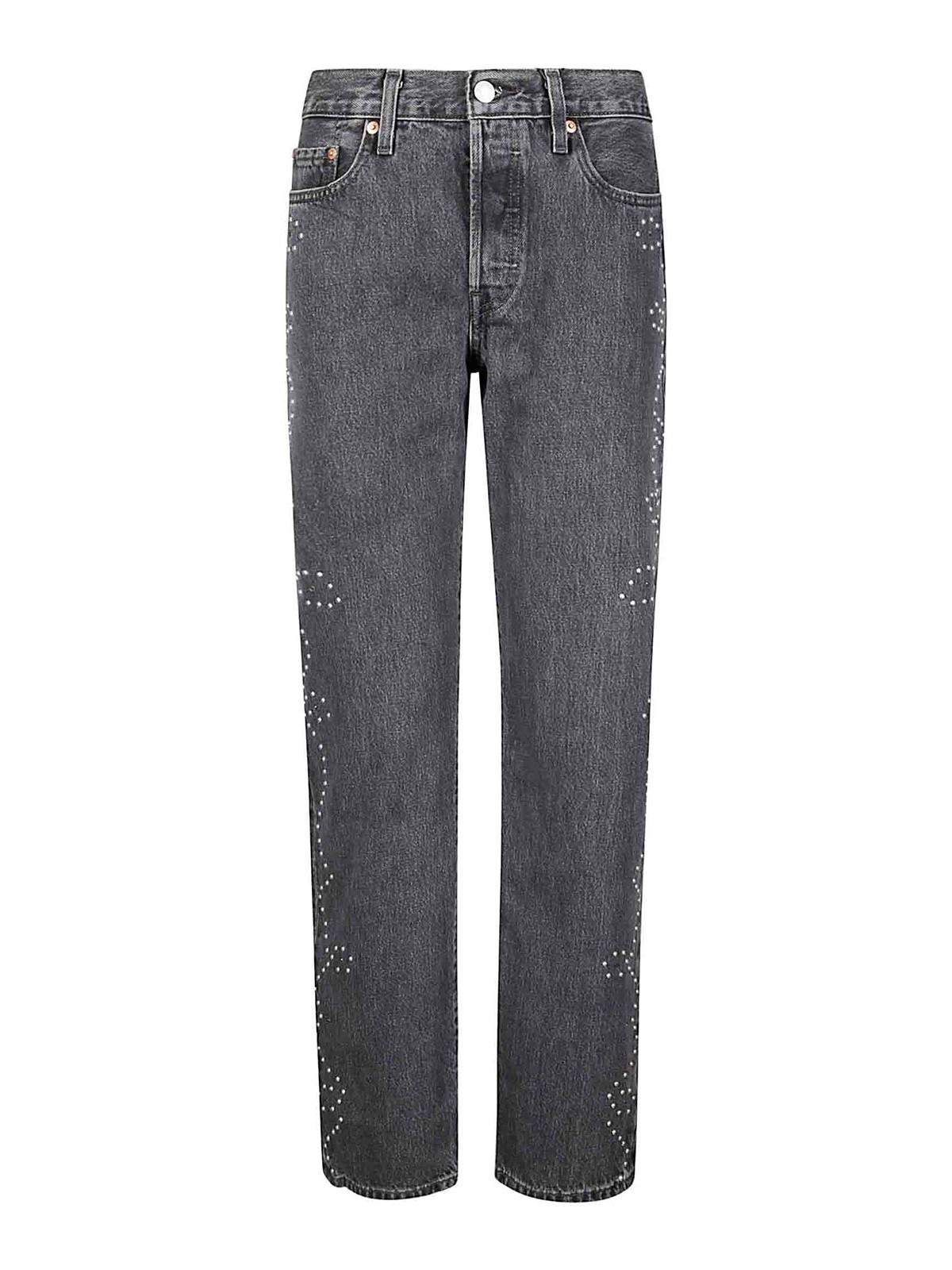Five-Pocket-Jeans, Knopfschlitz, gerades Bein, bequem am Oberschenkel, normale Passform, Nietendetail an der Beinlänge