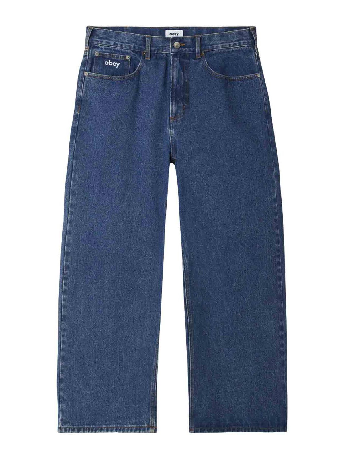 Beschreibung Denim-Arbeitshose mit Knopf- und Reißverschluss 5-Pocket-Münztasche im Denim-Stil mit gesticktem Logo, Obey Eyes Label auf der Gesäßtasche, 100% Baumwolle, 13,5 oz Denim, lockere Passform, 20 Beinöffnung, weit geschnittenes Bein mit leicht abgeschrägter Passform