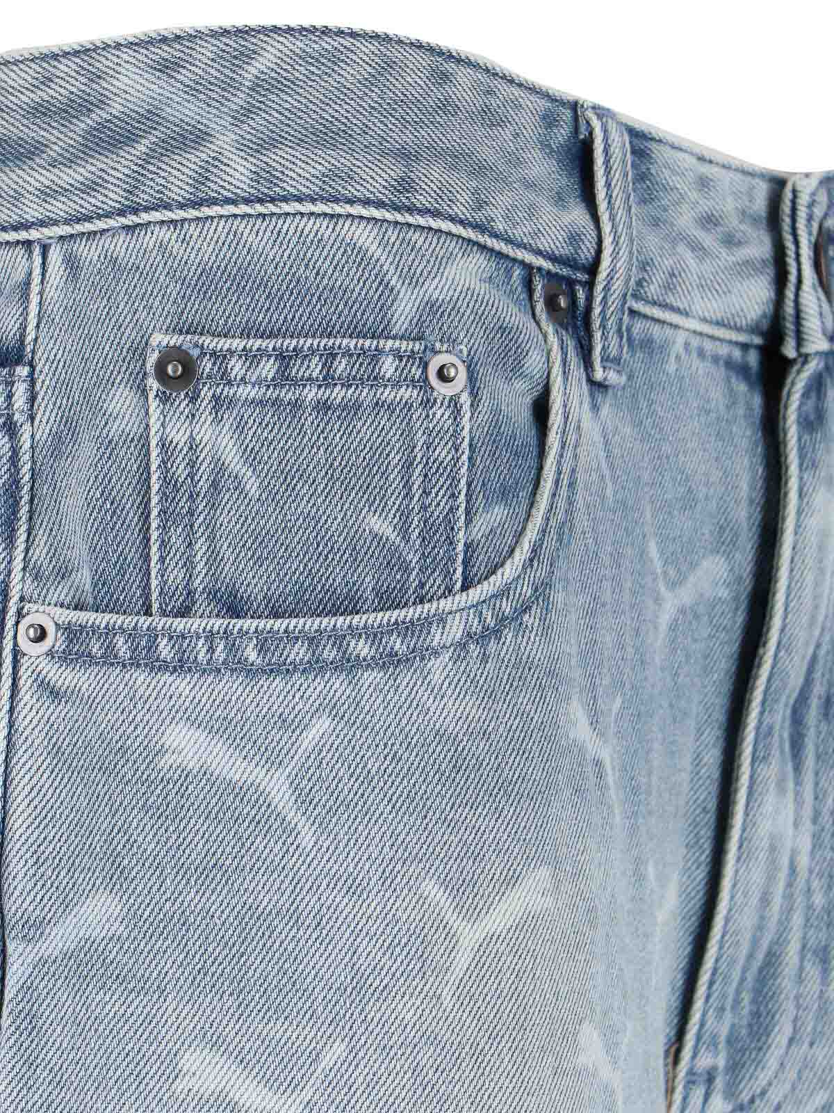 Puma x a$ap Rocky Straight Jeans aus hellblauem Baumwolldenim, durchgehender Monogramm-Logoprint, mittlerer Bund, Knopf- und Reißverschluss, Gürtelschlaufen, Fünf-Pocket-Design, gestickte Details an den Gesäßtaschen, kontrastierender Lederpatch auf der Rückseite.