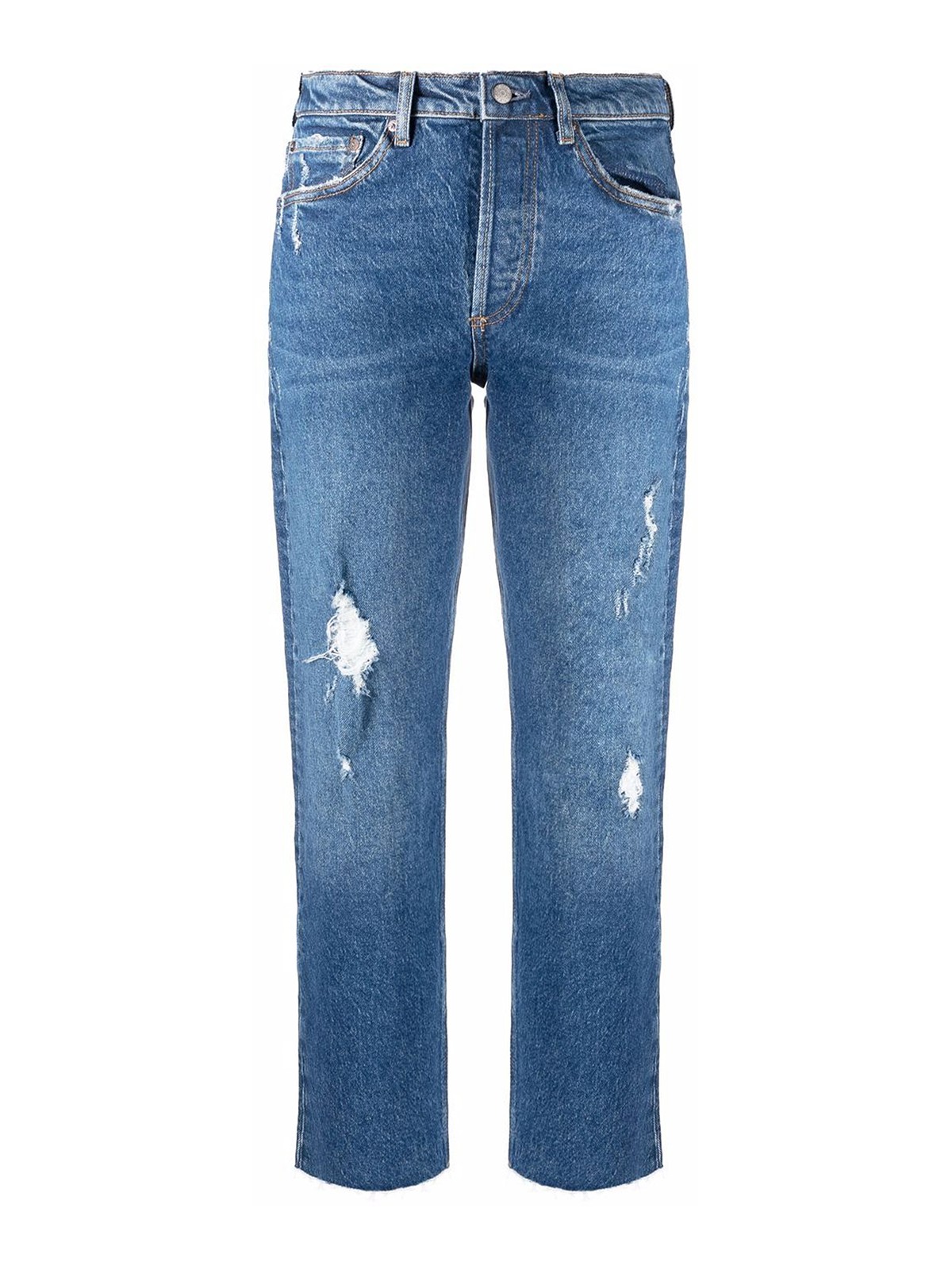 Blaue Denim-Jeans aus Baumwolle mit gerippten Details von Boyish Jeans mit zerrissenen Details an der Vorderseite, Knopf- und Reißverschluss, Gürtelschlaufen, zwei abgerundete Taschen an den Seiten, kurz geschnittenes Bein und zwei aufgesetzte Gesäßtaschen. Dieses tierbewusste Produkt stammt von einer von der PETA zugelassenen veganen Marke, sodass Sie sicher sein können, dass Sie den Tierschutz unterstützen