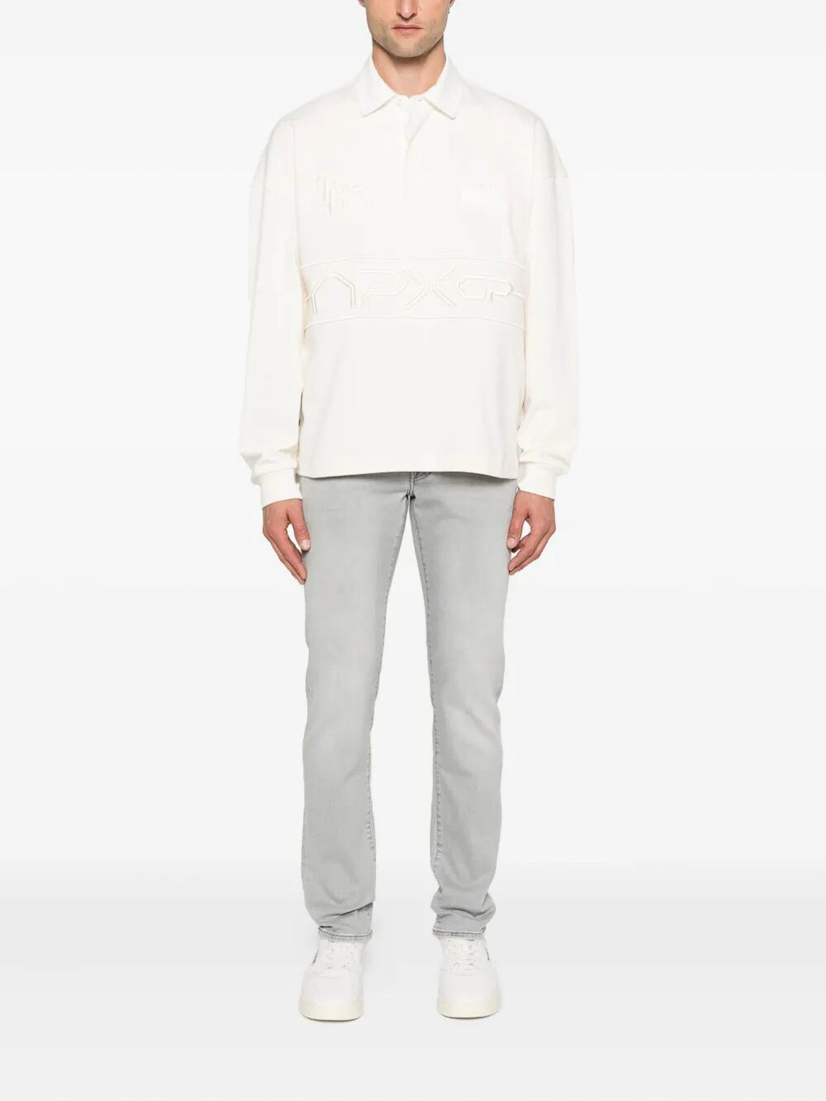 Hellgrau, Knopf- und Reißverschluss auf der Vorderseite, fünf klassische Taschen, Gürtelschlaufen, rückseitiger Logo-Patch