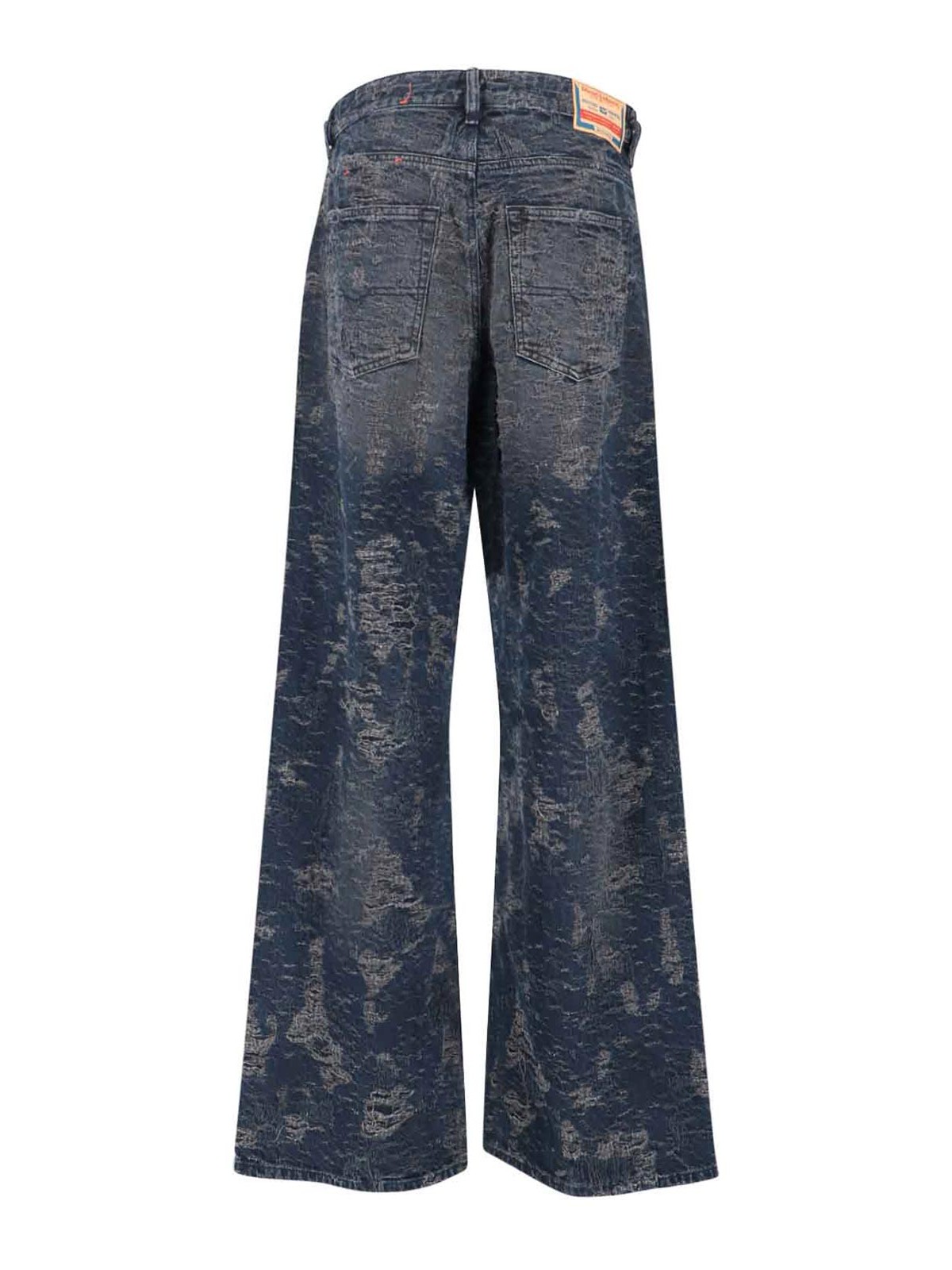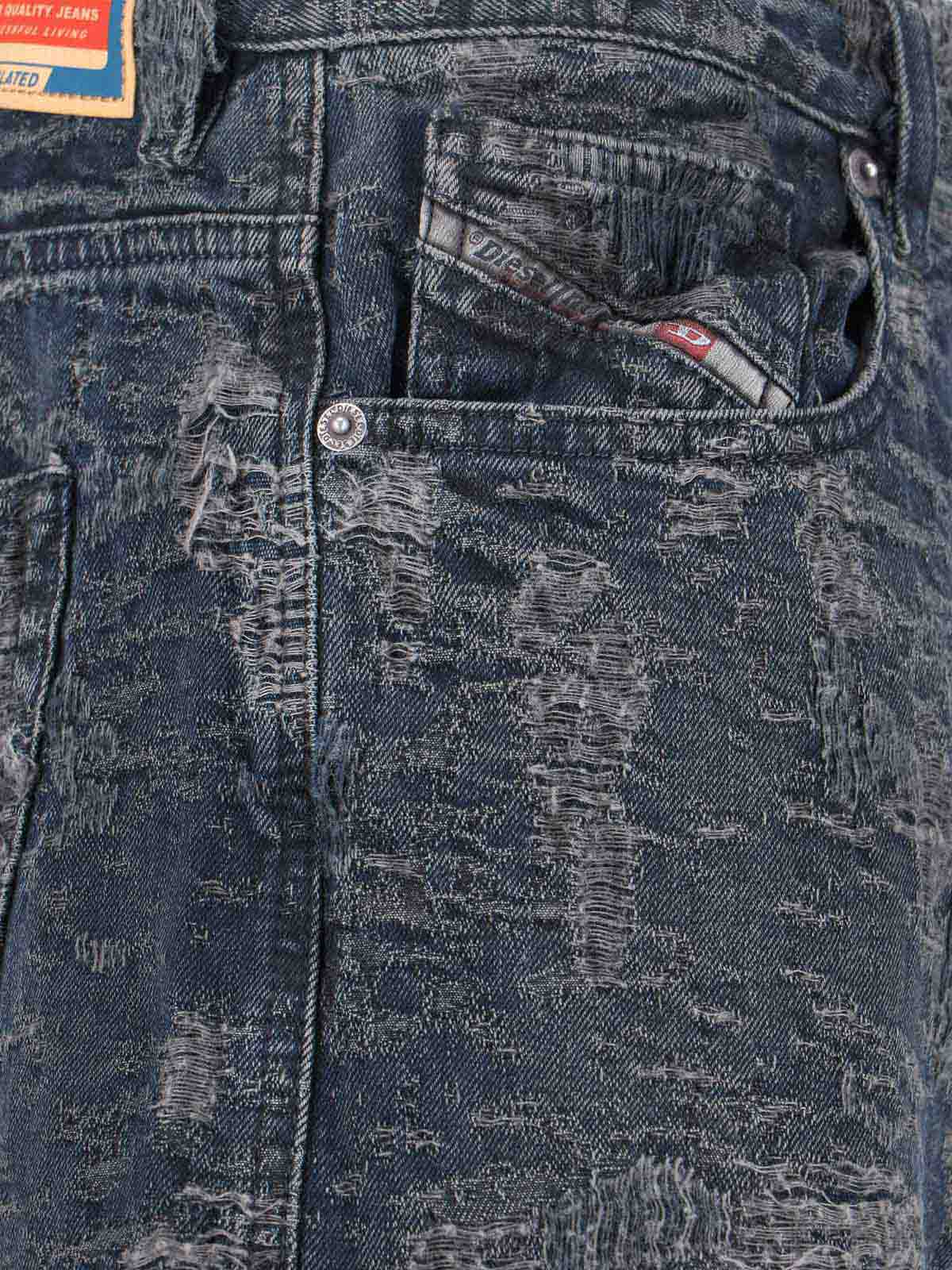Diesel Relax-Jeans aus dem Jahr 1996, aus schwarzer Biobaumwolle, Destroyed-Effekt, Fünf-Pocket-Design, Gürtelschlaufen, Knopfverschluss, Logo auf der Tasche, brauner Logo-Patch auf der Rückseite, weites Bein.