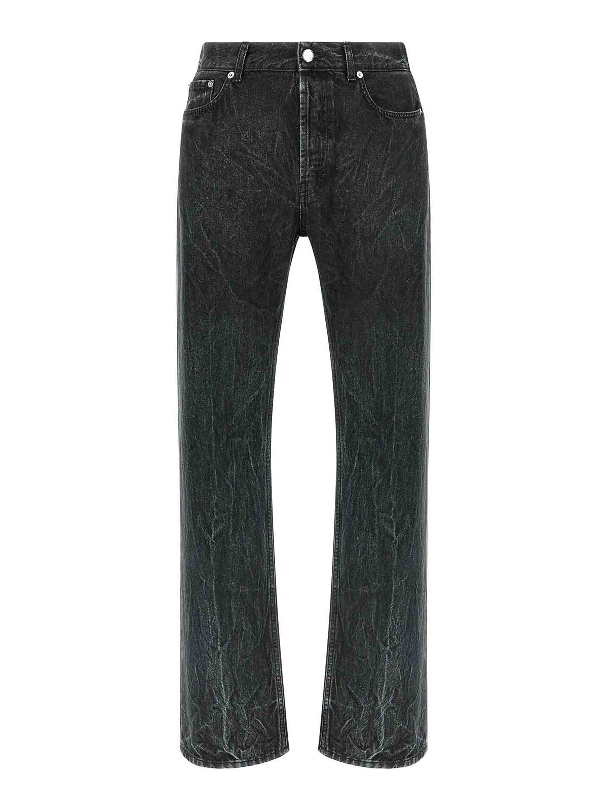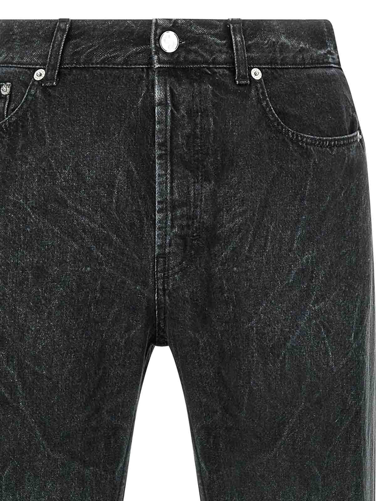 Klassisch geschnittene Jeans aus italienischem Baumwolltwill für Rechtshänder, 12 Unzen, schwarze Marmorwaschung, reguläre Taille, gerades Bein, Knopfverschluss auf der Vorderseite, fünf Taschen, rückseitiges Lederlogo.