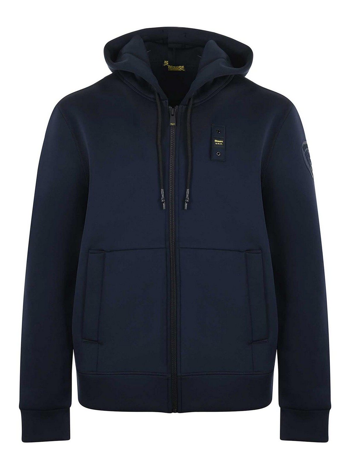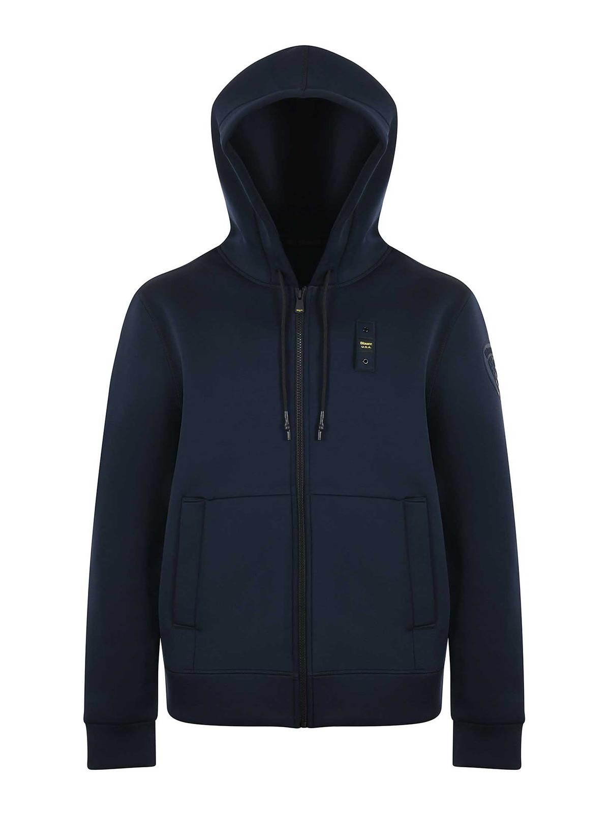 Blauer Neopren-Sweatshirt. Kapuze mit Kordelzug. Kängurutaschen. Logo-Patch auf der Brust. Heißgeprägtes Logo auf dem linken Ärmel. Abgebildete Größe: m 90% Polyester, 10% Elastan