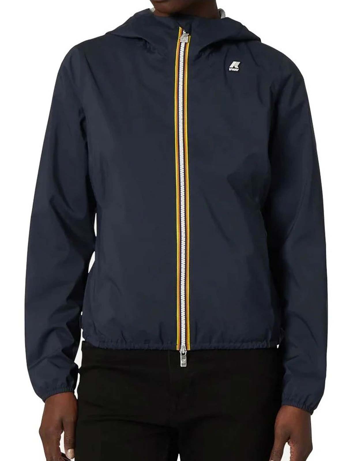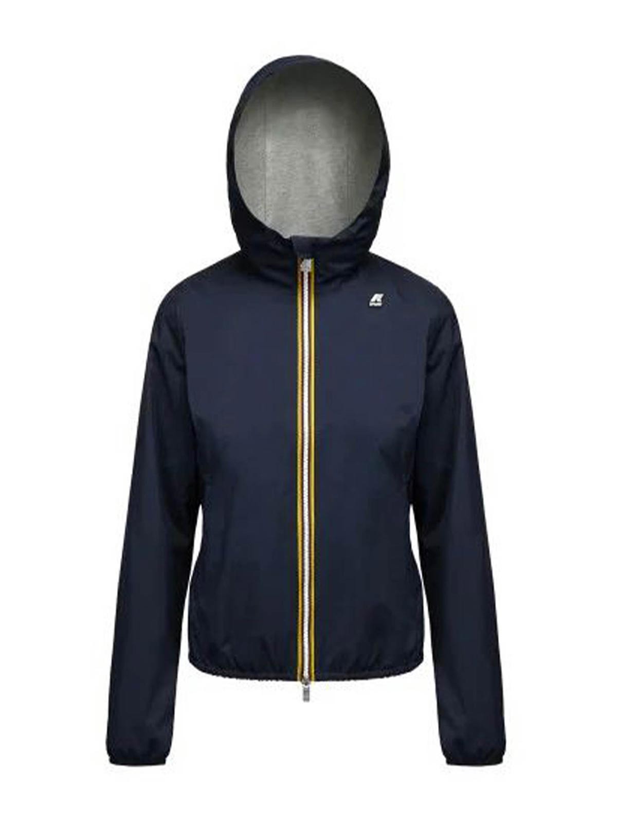 Blaue Jacke von K-Way mit klassischem Kapuzenpulli, Frontreißverschluss, zwei Seitentaschen, langen Ärmeln, schmaler Schnitt