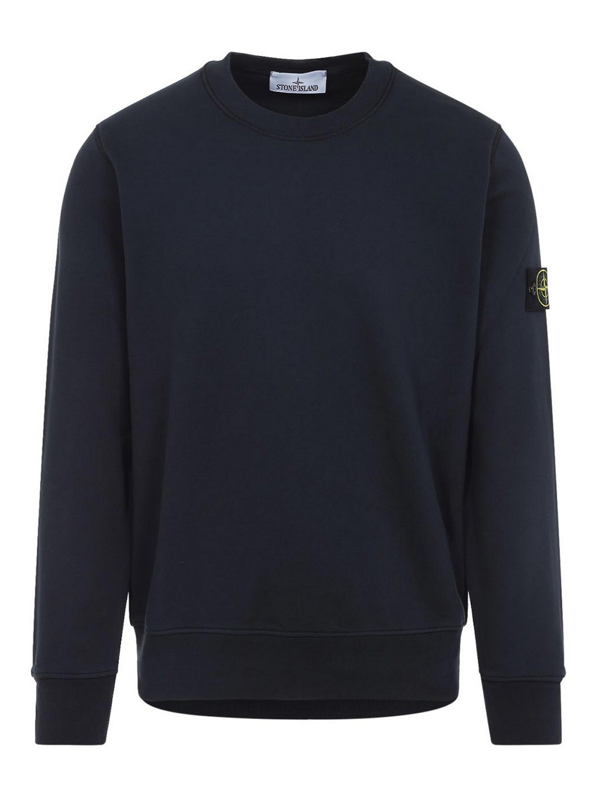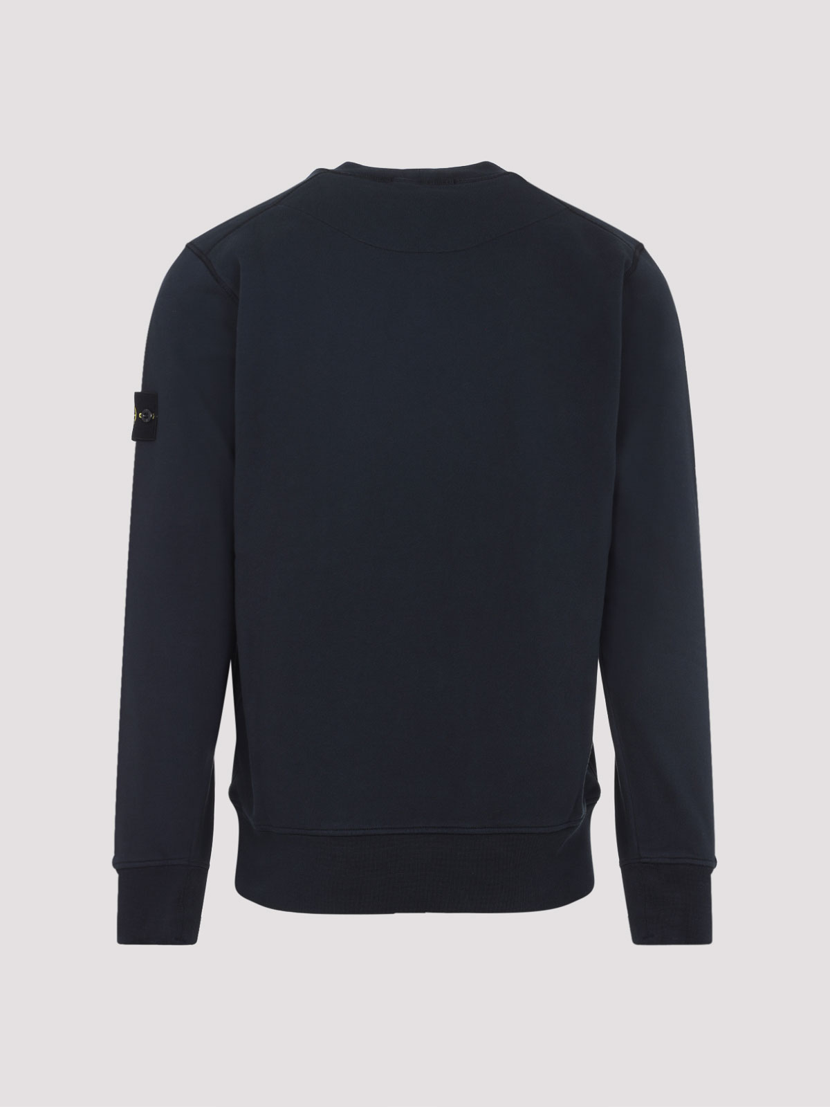 Stone Island marineblaues Baumwoll-Sweatshirt. Marineblaues Baumwollfleece, runder Halsausschnitt, lange Ärmel, ikonisches Markenlabel am Ärmel, feine Rippkanten, gerader Saum.