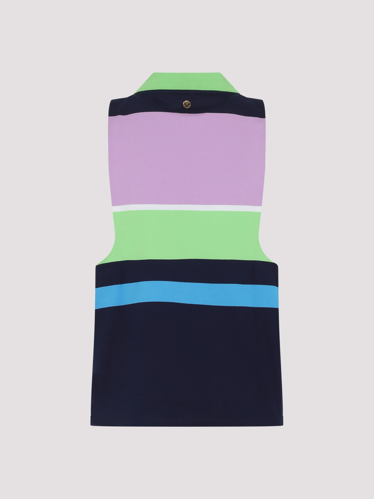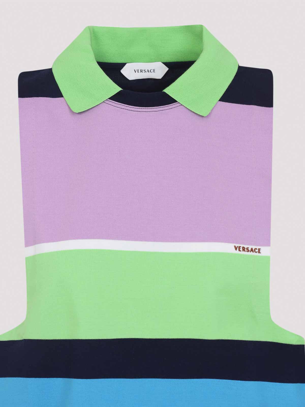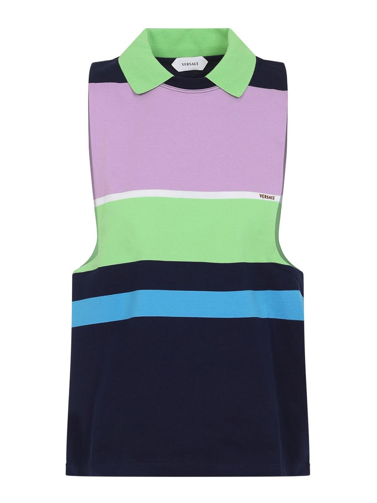 Versace hellrosa Baumwoll-Sweatshirt aus schwerer gestreifter Baumwoll. Sweatshirt aus reiner Baumwolle, spitzer grüner Kragen, seitliches gesticktes Logo mit braunem Schriftzug, ärmelloser, gerader Saum. leuchtendes rosa, blaues, grünes, weißes und blaues Streifenmuster.