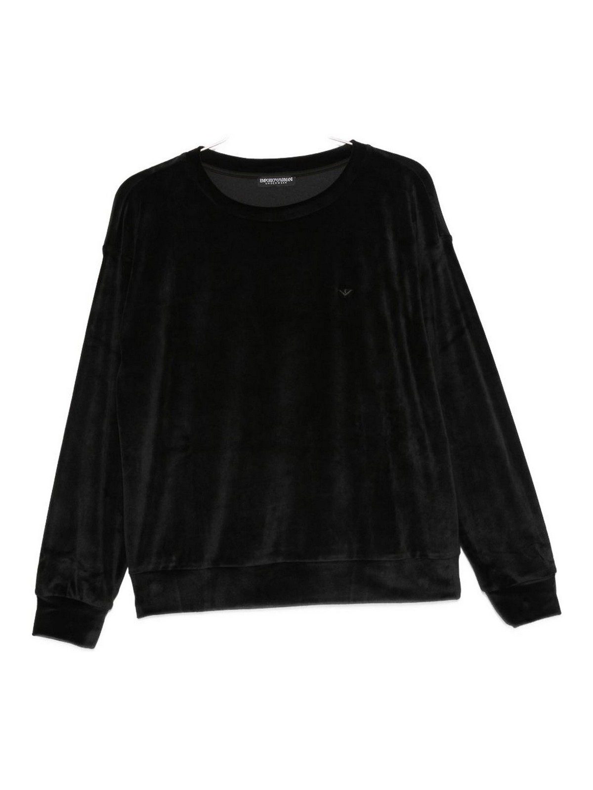 Schwarzer Samteffekt, Logo-Detail, Rundhalsausschnitt, lange Ärmel, elastischer Saum