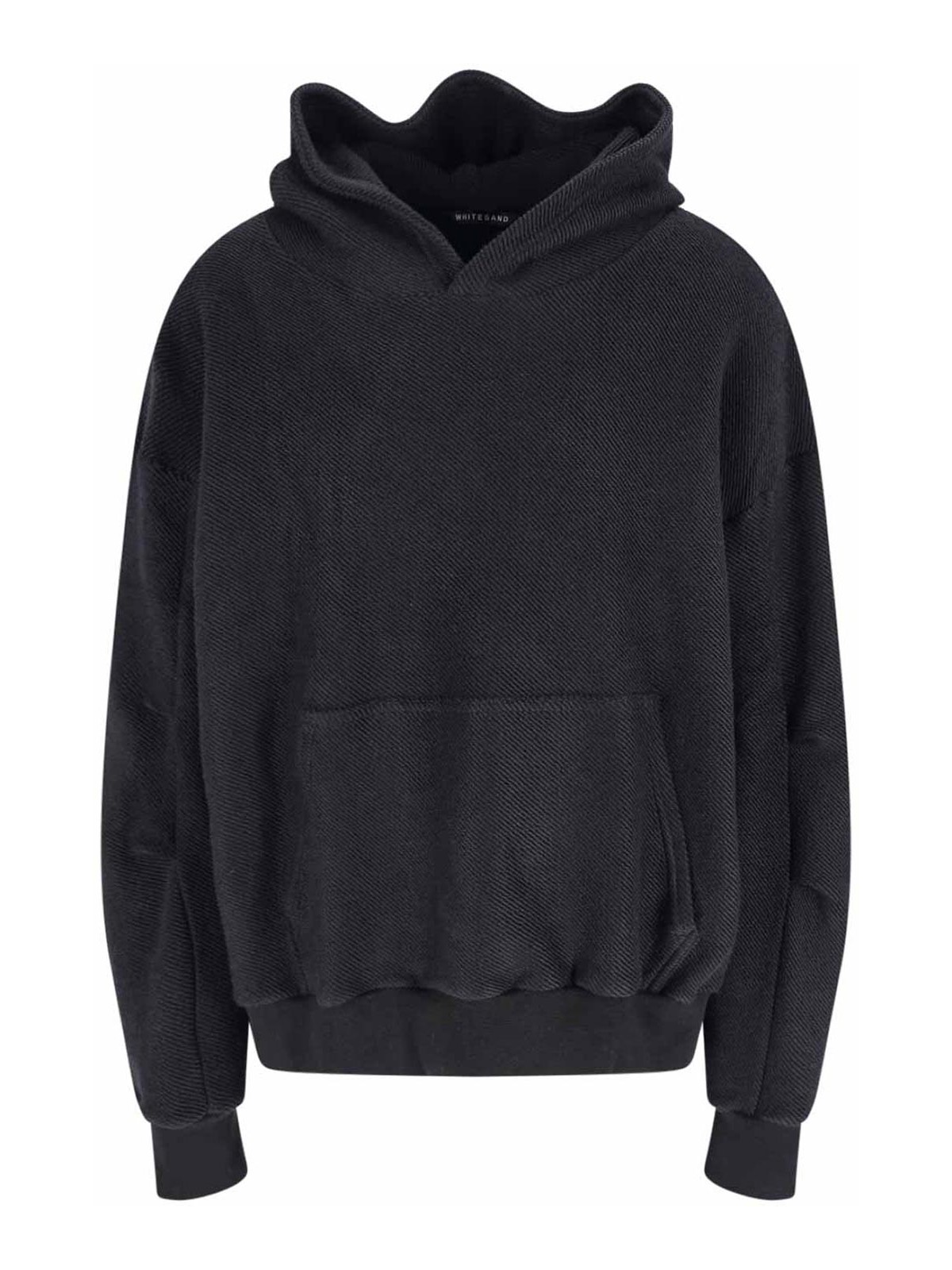 Weißes, sandfarbenes Kapuzensweatshirt aus schwarzer Baumwolle, Gabardine-Motiv, tief angesetzte Schultern, aufgesetzte Maxi-Tasche auf der Vorderseite, gerippte Abschlüsse, gerader Saum.