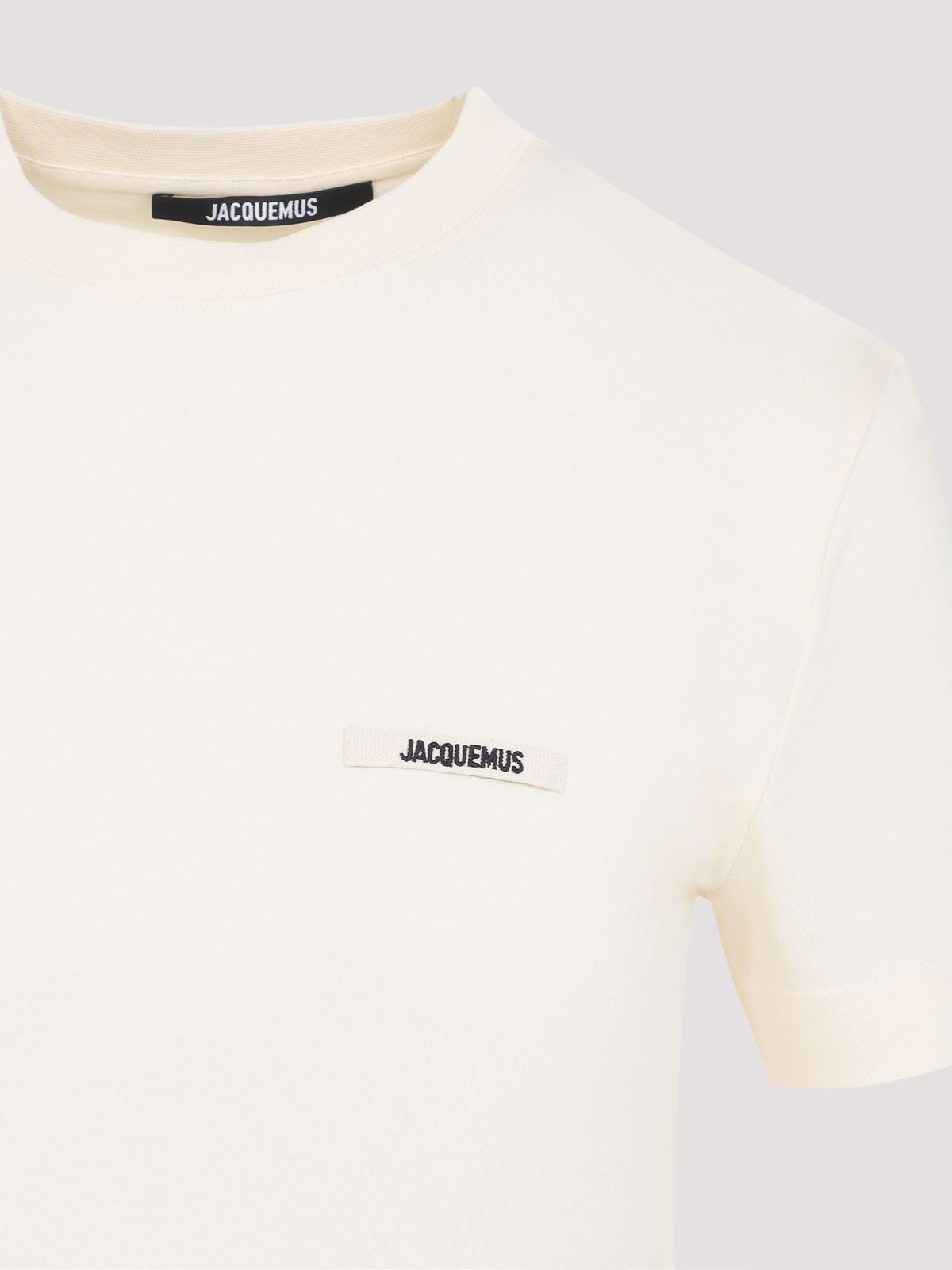 Hellbeiges Baumwoll-T-Shirt Jacquemus Le Grosgrain. gefertigt aus hellbeigem Baumwolljersey, runder Rippausschnitt, kurze Ärmel, Ripsdetail mit gesticktem Logo auf der Brust, schmale Passform.