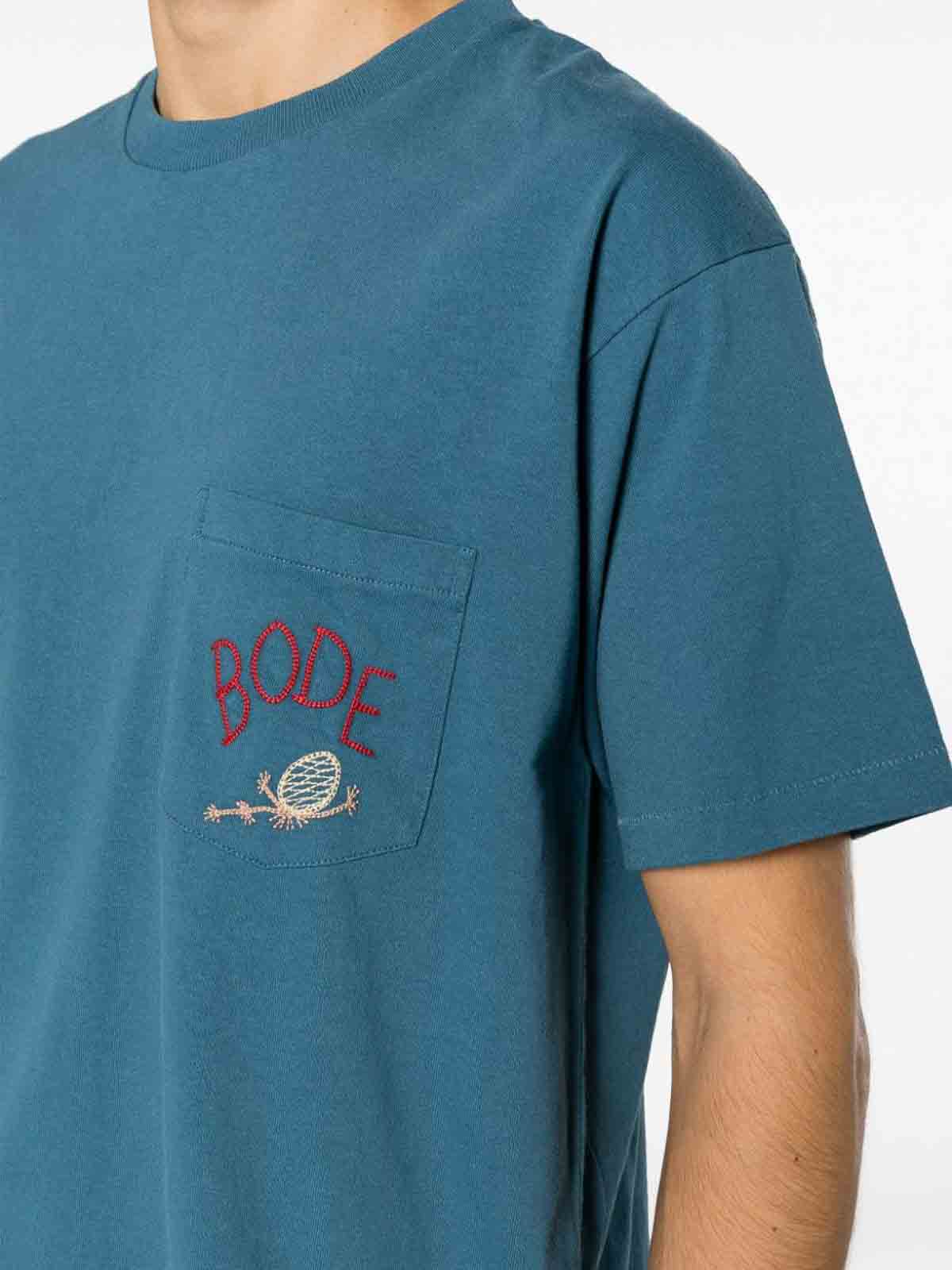 Sweet-T-Shirt mit Logostickerei aus Kiefernholz von Bode mit cyanblauer Textur, gesticktem Logo, Rundhalsausschnitt, kurzen Ärmeln, aufgesetzter Brusttasche und geradem Saum