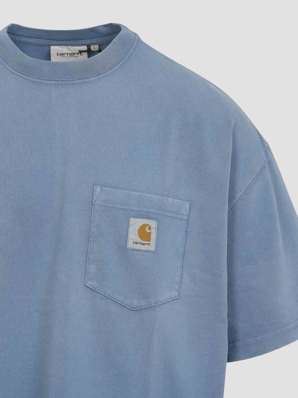 Carhartt T-Shirt aus Baumwolle mit kurzen Ärmeln und Hudson-Tasche in Sorrentblau. T-Shirt aus reiner sorrentblauer Baumwolle, Rundhalsausschnitt, aufgesetzte Brusttasche, Logo auf der Brust, abgesenkte Schultern, kurze Ärmel, gerader Saum, tonale Nähte.