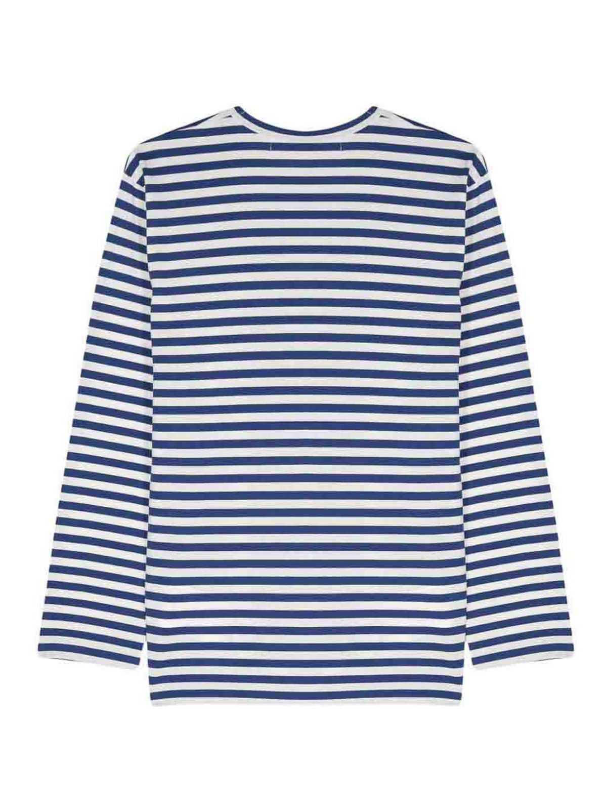 Blau-weiße Textur, horizontales Streifenmuster, Rundhalsausschnitt, lange Ärmel, charakteristischer Herz-Patch auf der Brust, gerader Saum beim Kauf