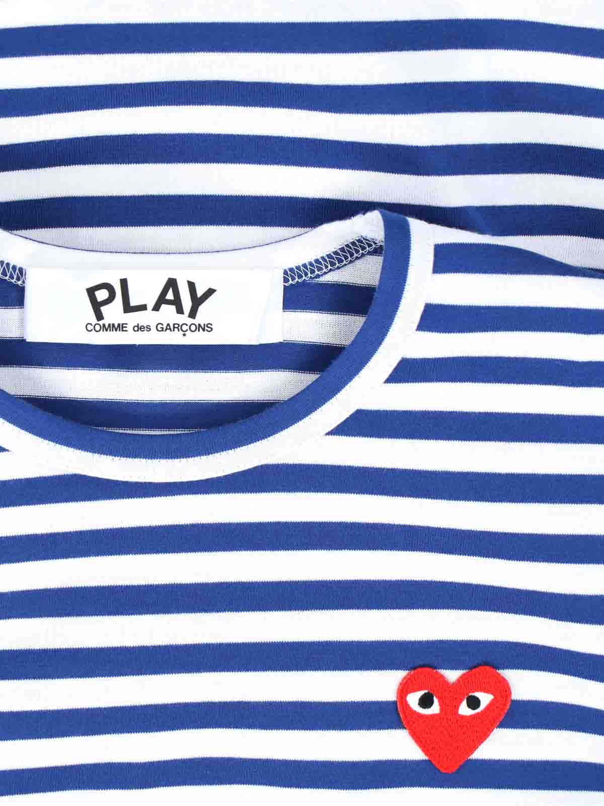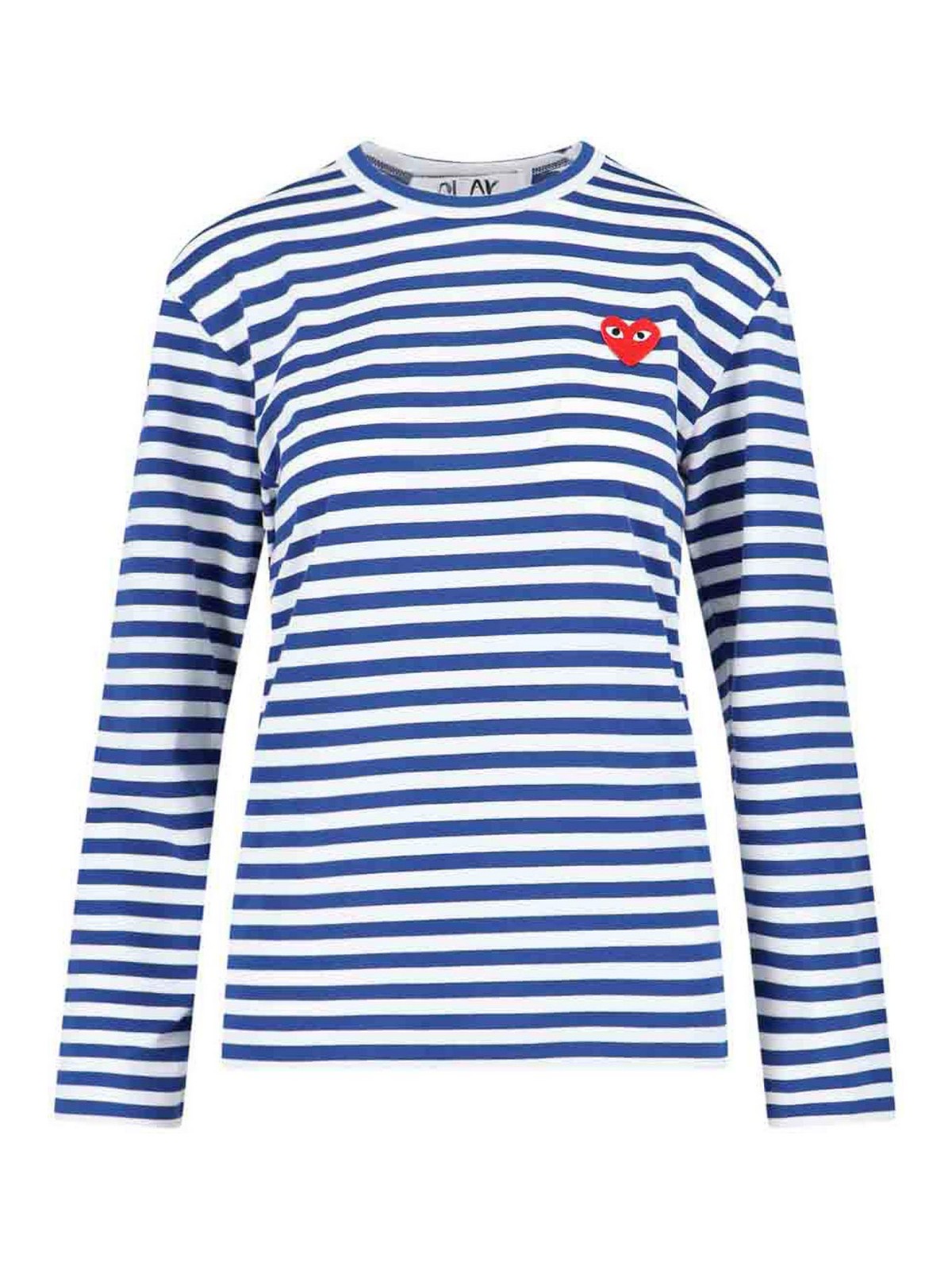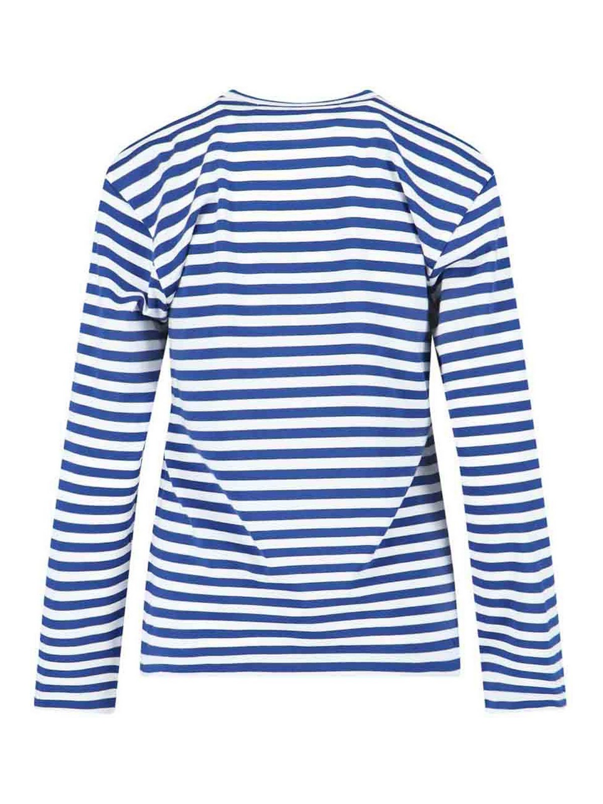 T-Shirt mit Logo Comme des Garons Play, aus blauer Baumwolle, Streifenmuster, Rundhalsausschnitt, lange Ärmel, Logo-Patch, rotes Herzmuster, unterer Rücken.