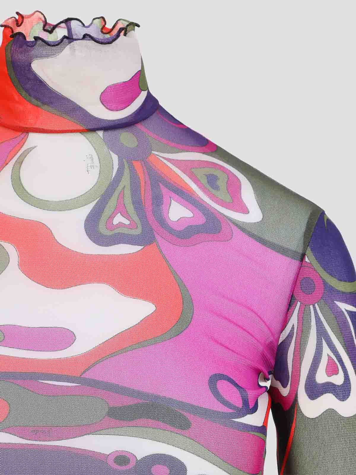 Mehrfarbiges T-Shirt aus Pucci-Tüll, gefertigt aus mehrfarbigem Mesh-Signaturprint, durchgehend mit Stehkragen, langen Ärmeln, schmaler Schnitt, Rüschenkanten