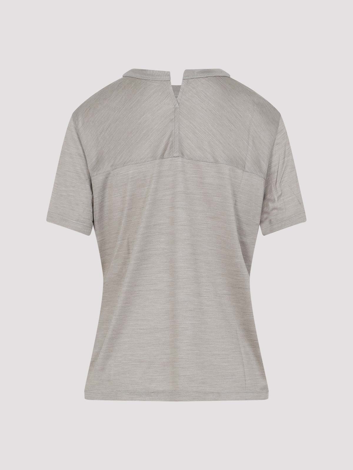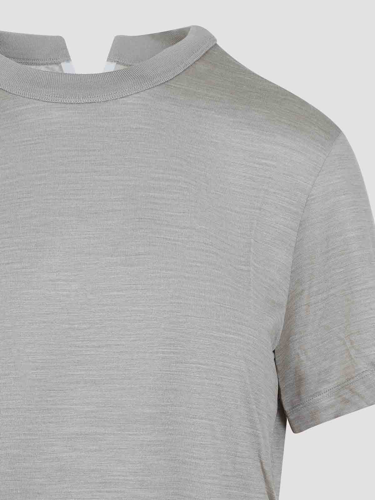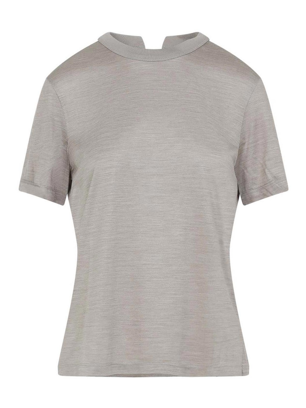 Geschnitztes graues, tailliertes T-Shirt, grauer Rundhalsausschnitt mit V-Ausschnitt auf der Rückseite, kurze Ärmel, gerader Saum