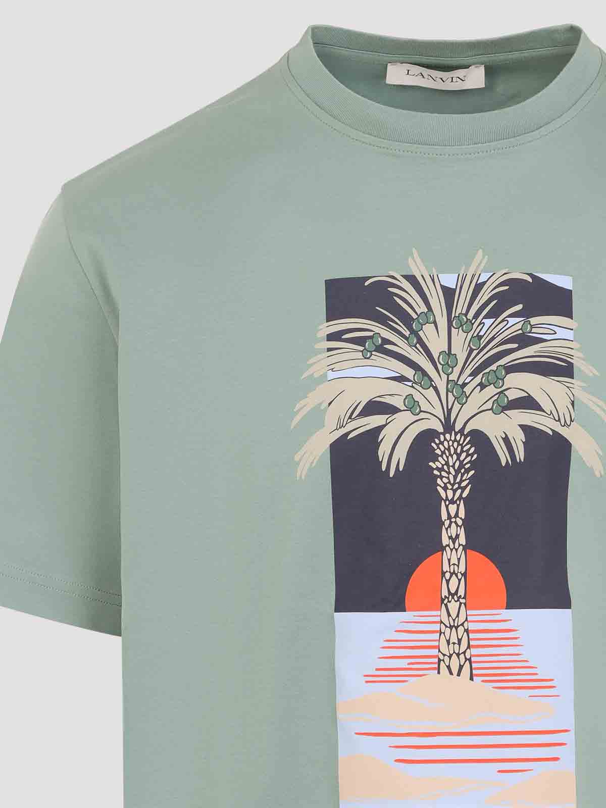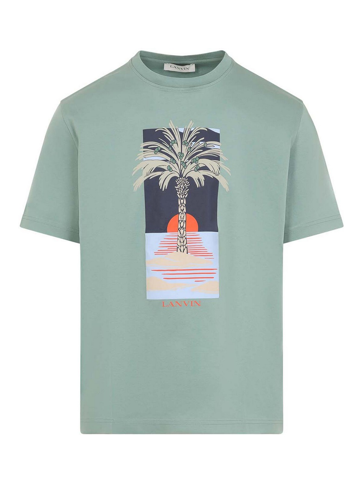 Lanvin bedrucktes grünes Baumwoll-T-Shirt. Hergestellt aus hellgrünem Baumwolljersey, runder Halsausschnitt, grafischer Aufdruck und Logo auf der Vorderseite, kurze Ärmel, gerader Saum.