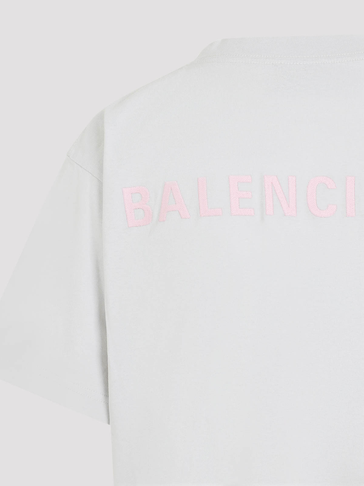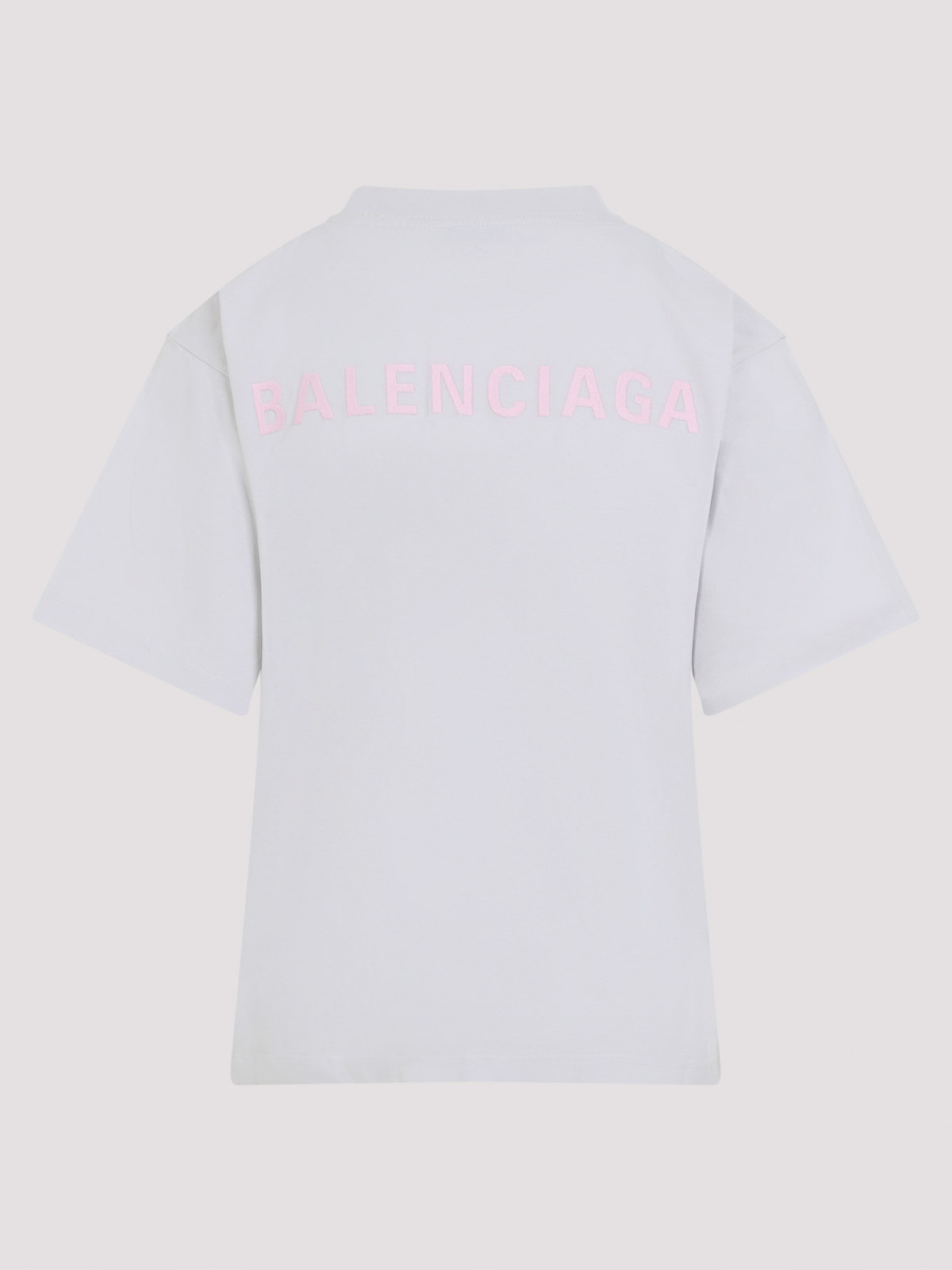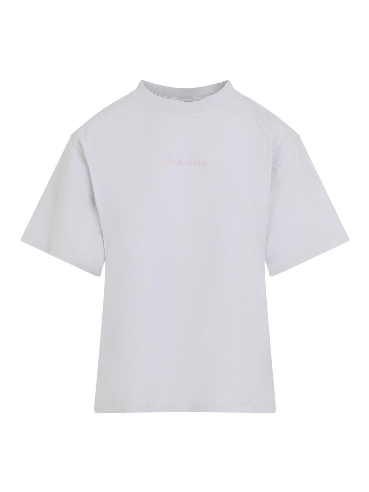 Weißes Balenciaga T-Shirt in mittlerer Passform, gefertigt aus schmutzig weißem Rundhalsausschnitt, rosafarbenes Logo auf Brust und Rücken, kurze Ärmel, gerader Saum