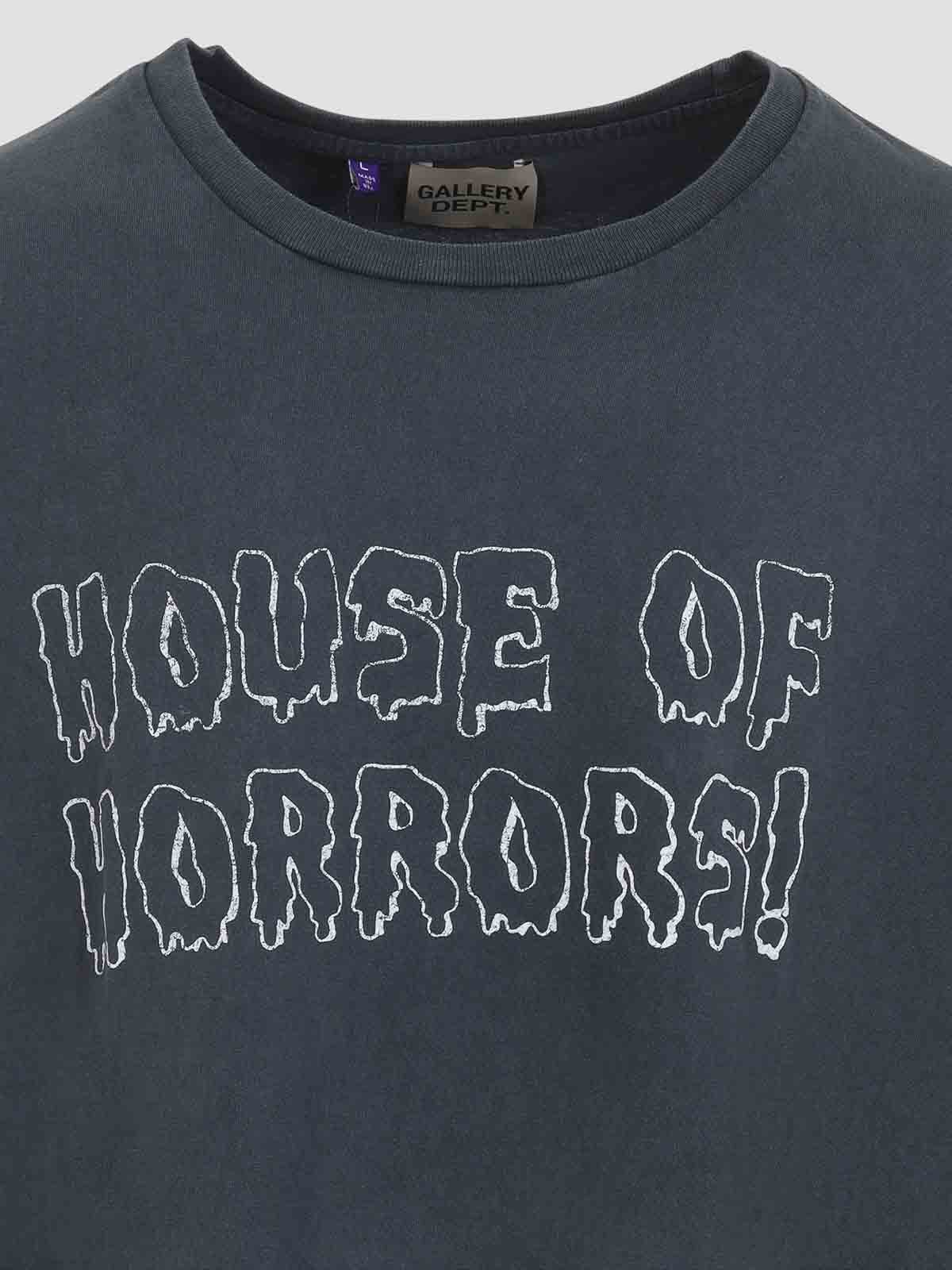 Schwarzes T-Shirt von Gallery Dept Horrors, gefertigt aus schwarzem, geripptem Vintage-T-Shirt mit Rundhalsausschnitt von House of Horrors! Logoprint auf der Rückseite, gerader Saum, lockere Passform