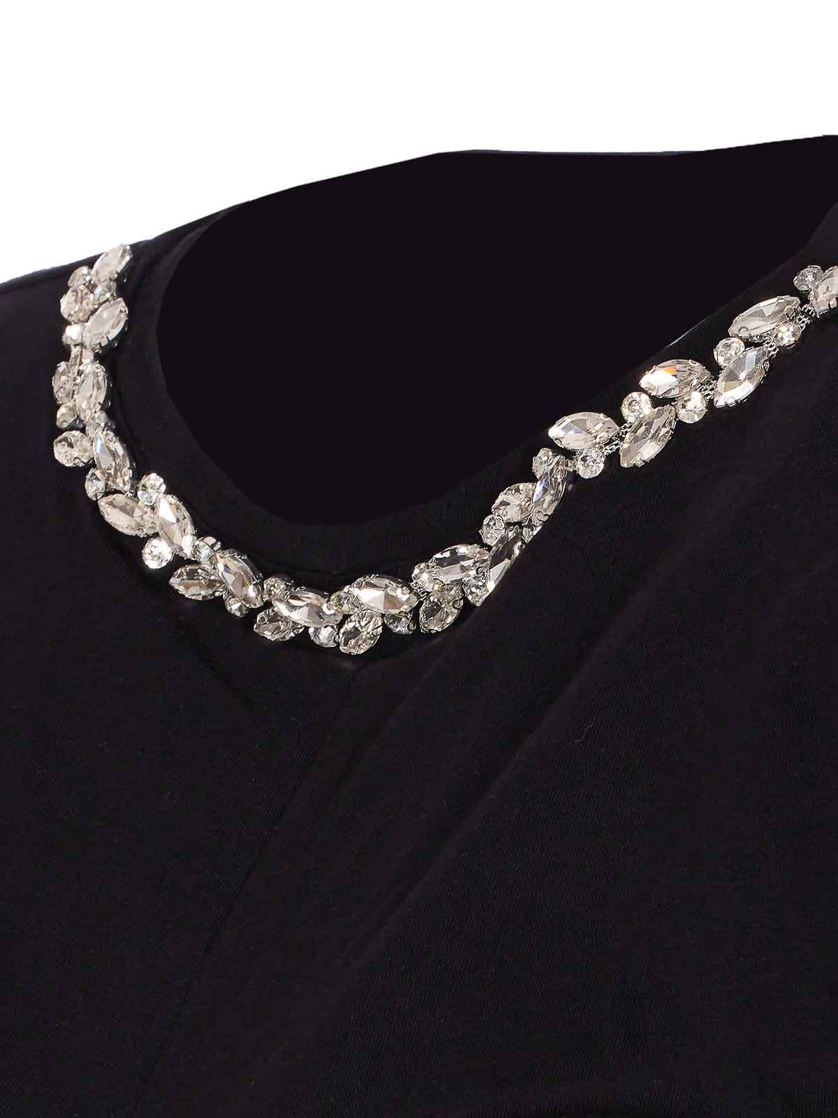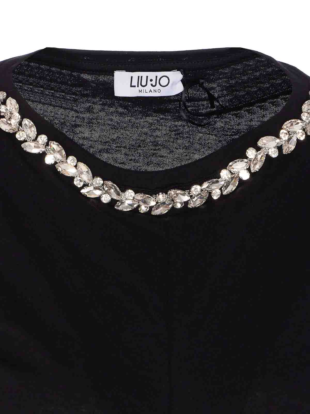 Liu Jo schwarzes T-Shirt, Kristalldetail am Kragen, gerafft