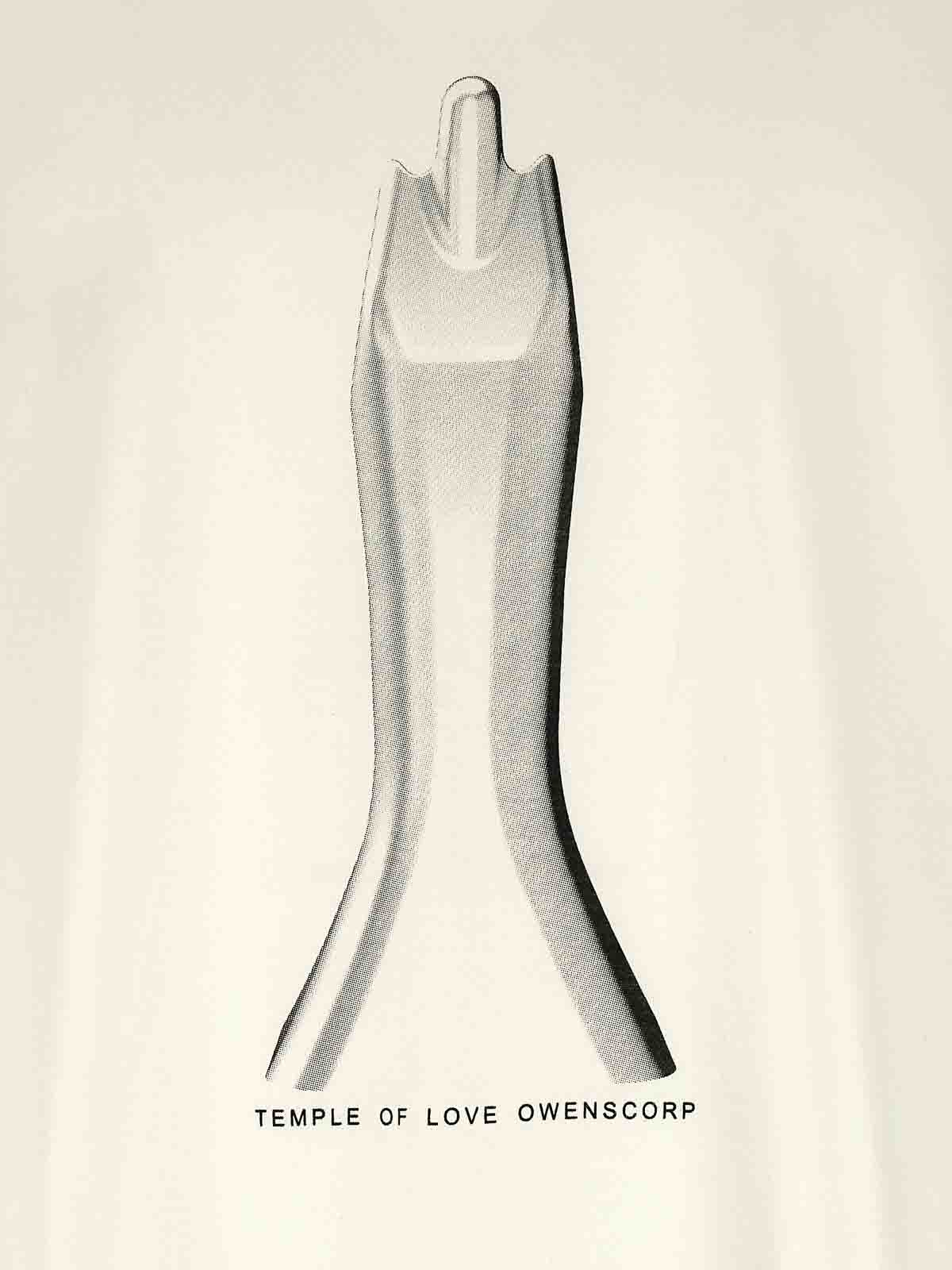 Jumbo-T-Shirt aus schwerer Baumwolle mit Aufdruck „Temple of Love Owenscorp“ auf der Vorderseite, Rundhalsausschnitt, kurze Ärmel mit abgesenkten Schultern.