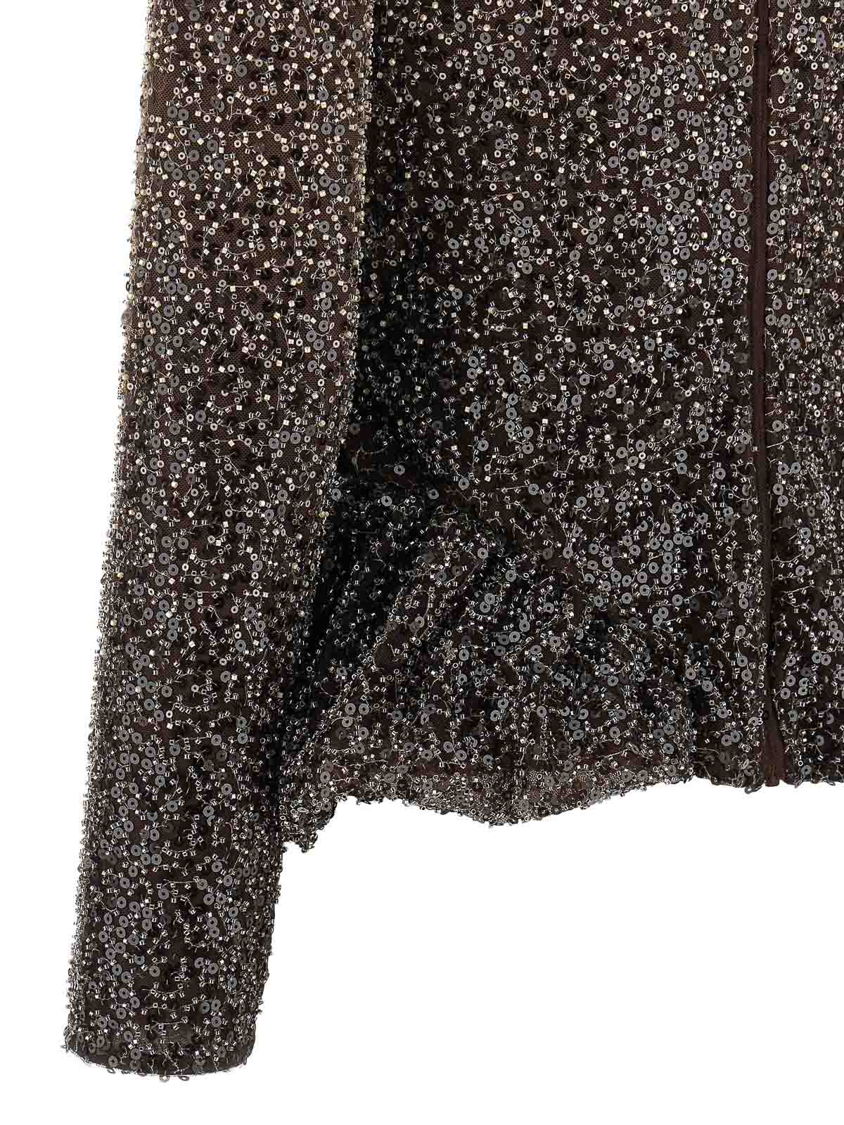 Oberteil mit Pailletten und durchgehenden Perlen, Schößchen an der Taille, hoher Ausschnitt, rückseitiger Reißverschluss, lange Ärmel