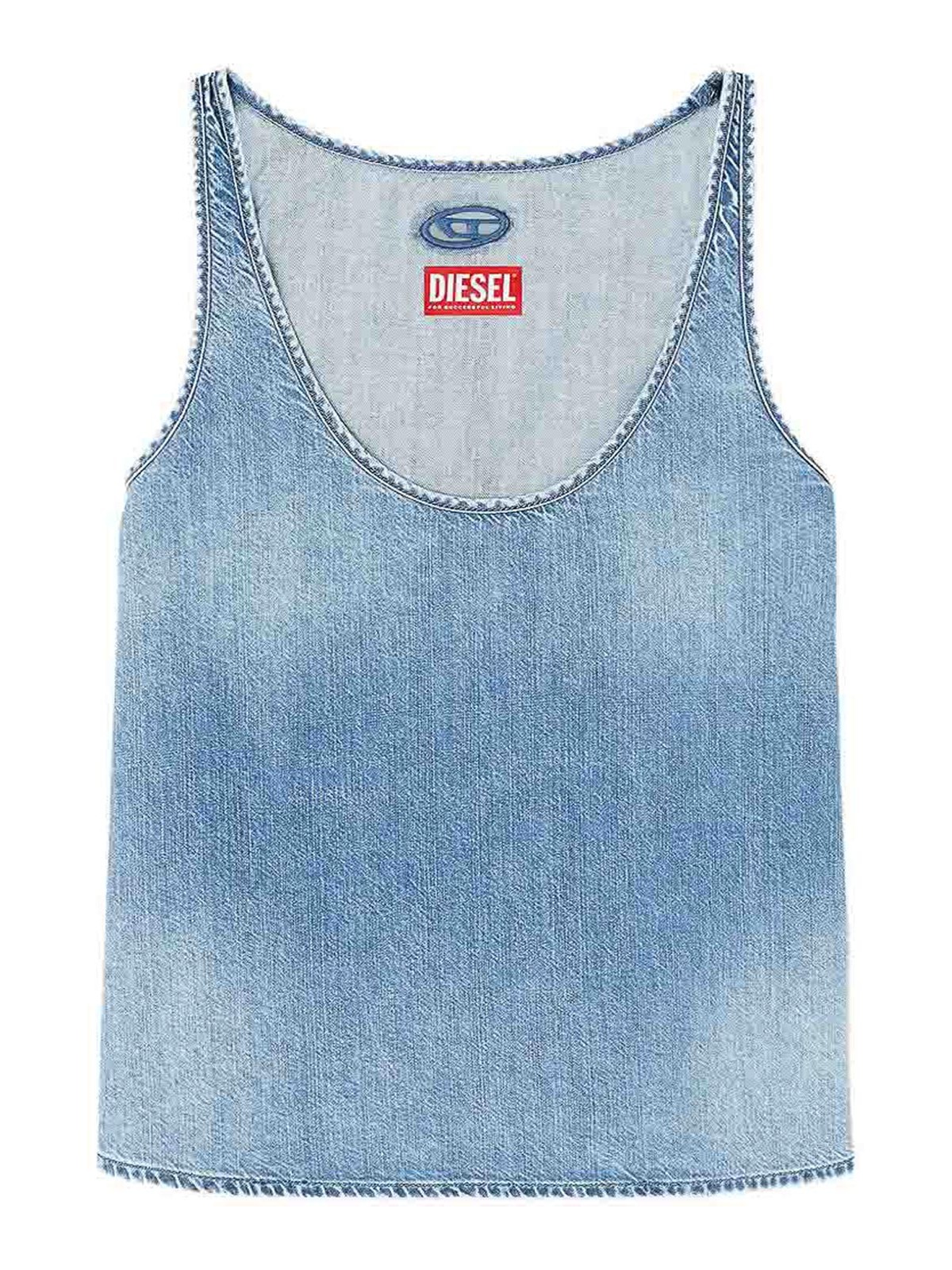 Top aus hellblauer Baumwolle mit U-Ausschnitt, Ärmellos und Logo-Detail von Diesel, mit schmal geschnittenem Design und dezentem Branding. Ideal für lässige, schicke Outfits oder moderne Sommerlooks. Dieses Top vereint Komfort, Qualität und modernen Stil in einem vielseitigen, tragbaren Stück