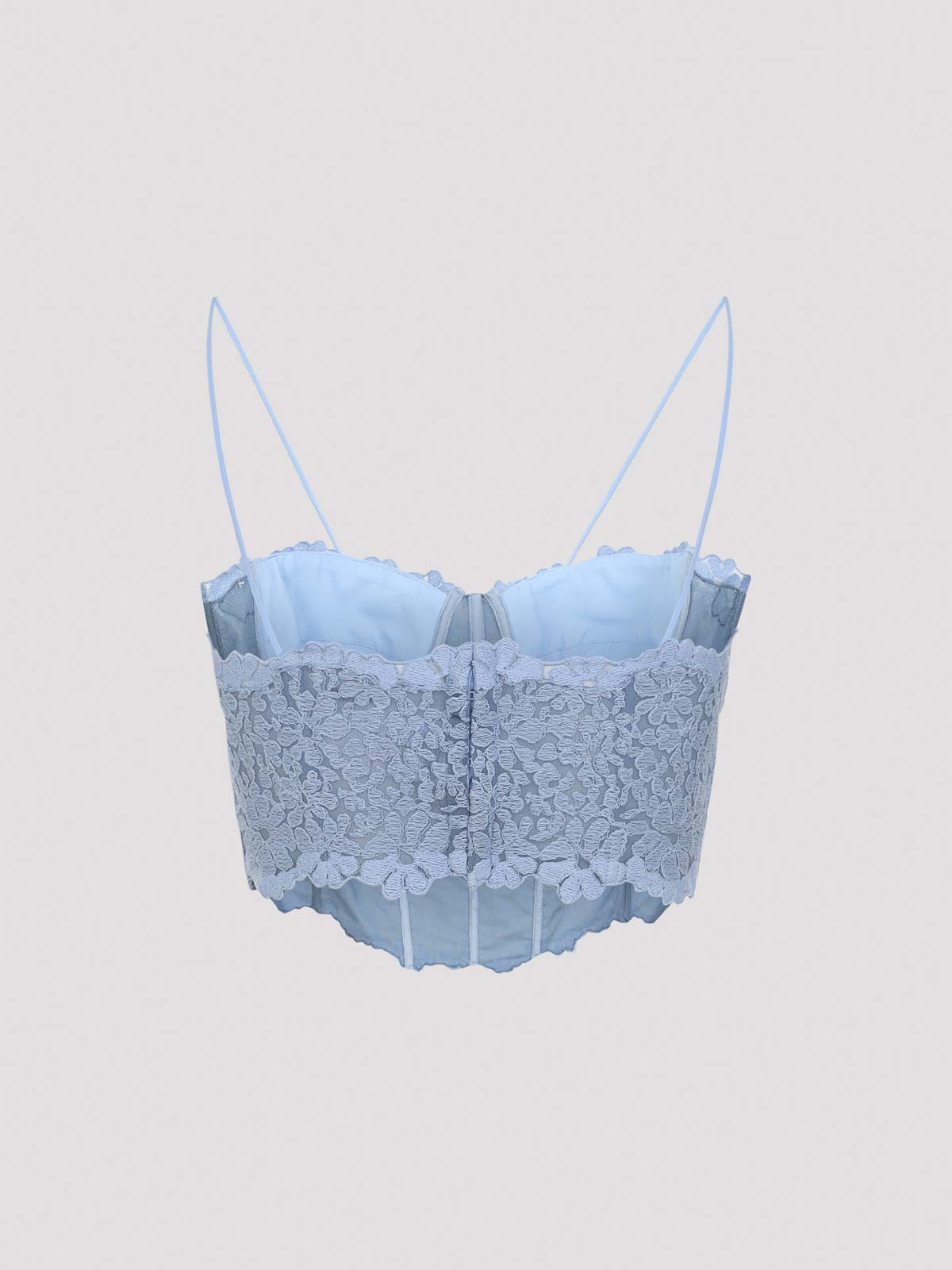 Hellblaues Bustier-Top aus Polyester von Ermanno Scervino. Bustier-Top mit Bügel aus hellblauer Spitze. Es verfügt über vorgeformte Cups, einen herzförmigen Ausschnitt, dünne Riemen, einen Schnallenverschluss auf der Rückseite und gewellte Säume.
