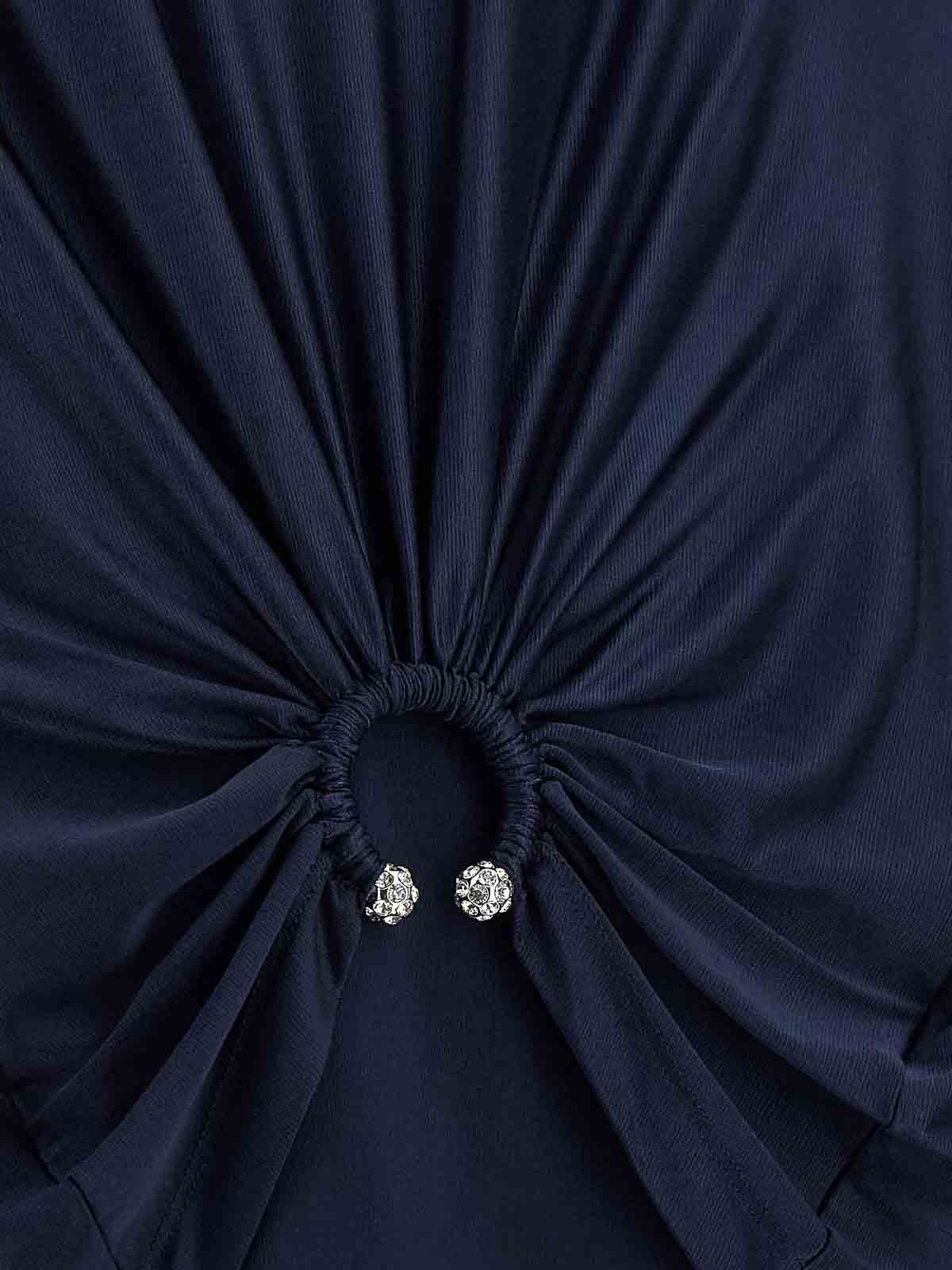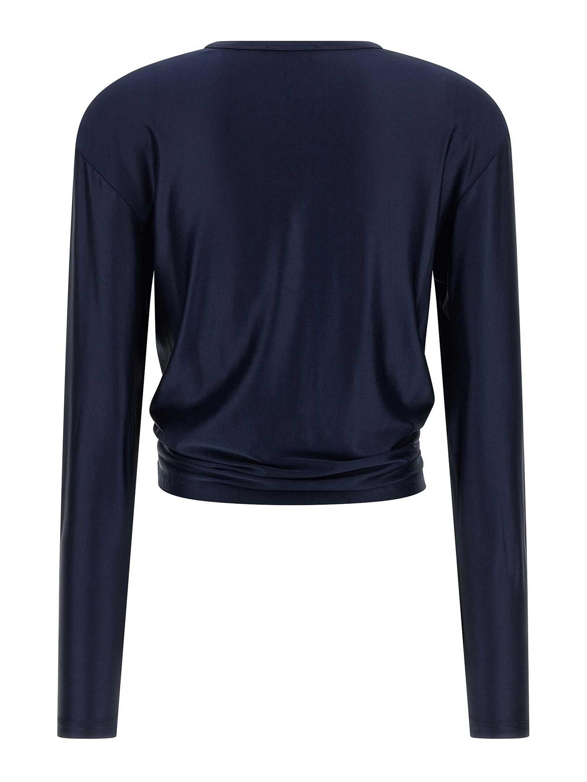 Top aus Satin-Viskose, Piercing-Detail aus Metall mit Kristallen auf der Vorderseite, die für eine Drapierung sorgen, Crop-Modell, Rundhalsausschnitt, lange Ärmel, asymmetrischer Saum.