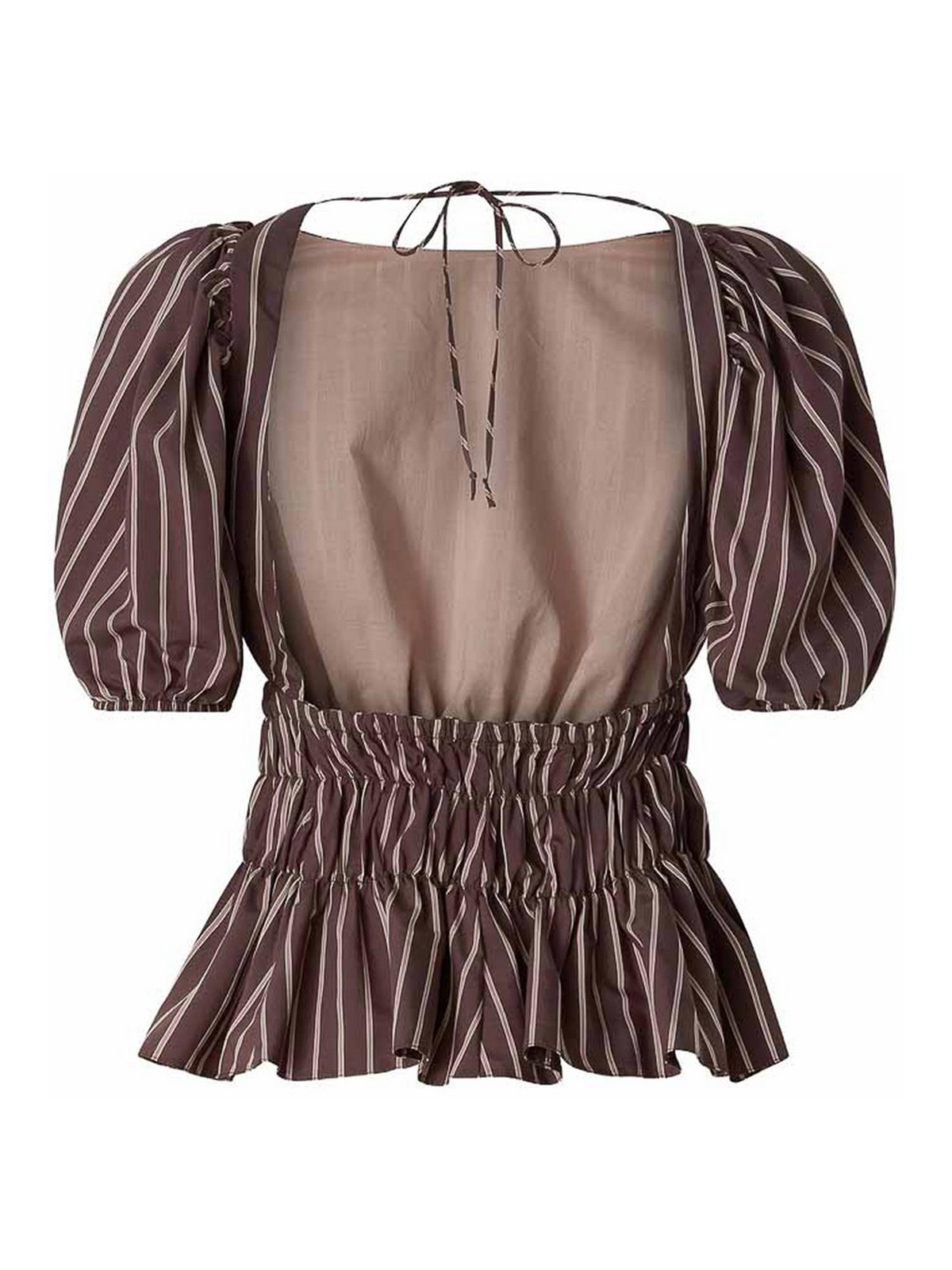 Braunes Streifenmuster, Rüschendetail, offener Rückenverschluss, Puffärmel