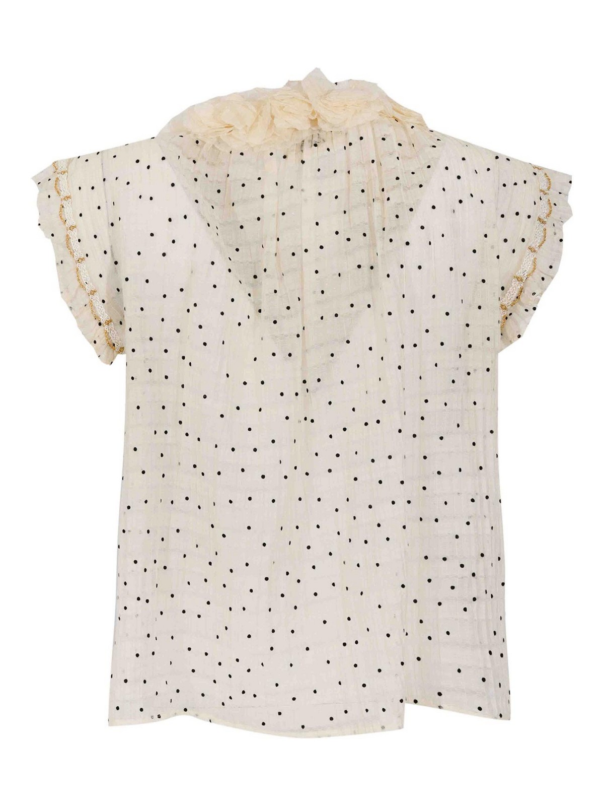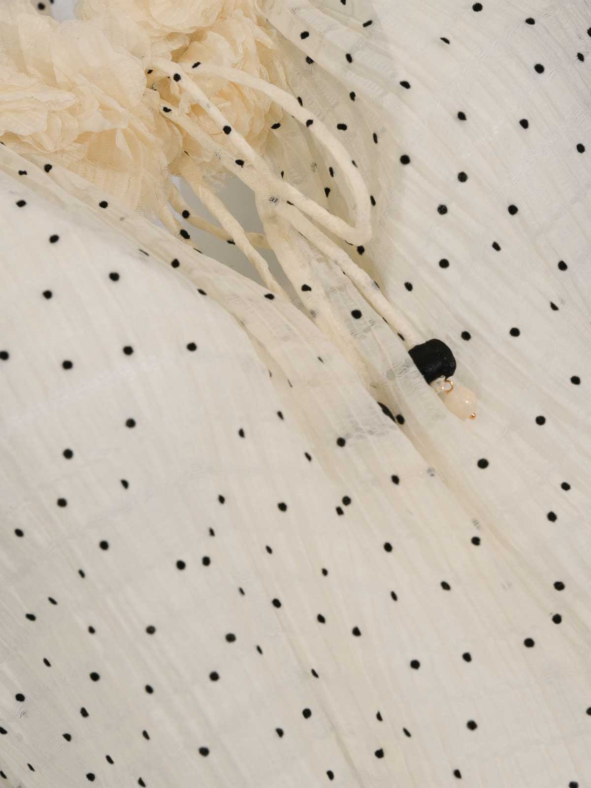 Damentop aus Tüll aus Tencel-Mischung, Amosa, Tupfenmodell, Stoff: heller Tüll, Muster: Tupfen, Ärmel: kurz mit geraffter Kante und Spitzendetail, Kragen: V-Ausschnitt mit Rüschen, Verschluss: vordere Schnürsenkel mit dekorativen Quasten, Taschen: nicht vorhanden, Details: gerafft, Spitzeneinsätze, halbtransparente Verarbeitung, Futter: nein, Passform: weich