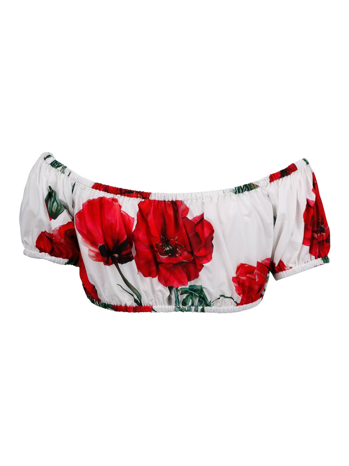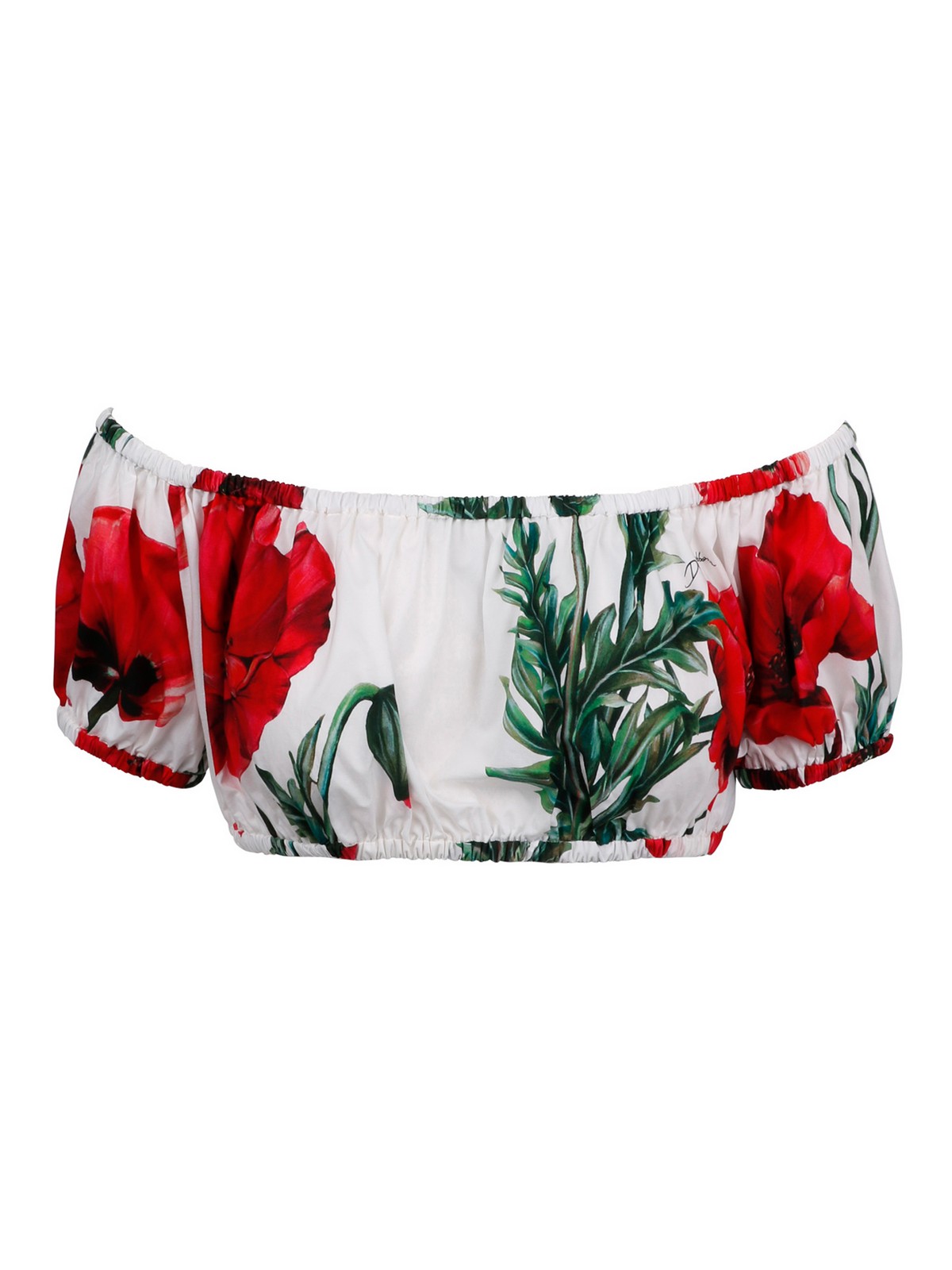Kurzes Oberteil, Papaveri-Print, Bardot-Ausschnitt, Kurzärmel und elastischer Bund.