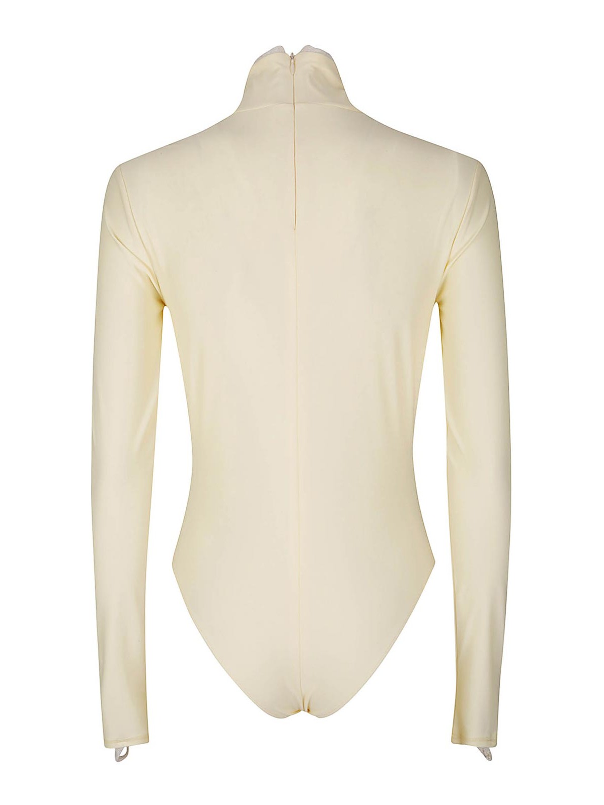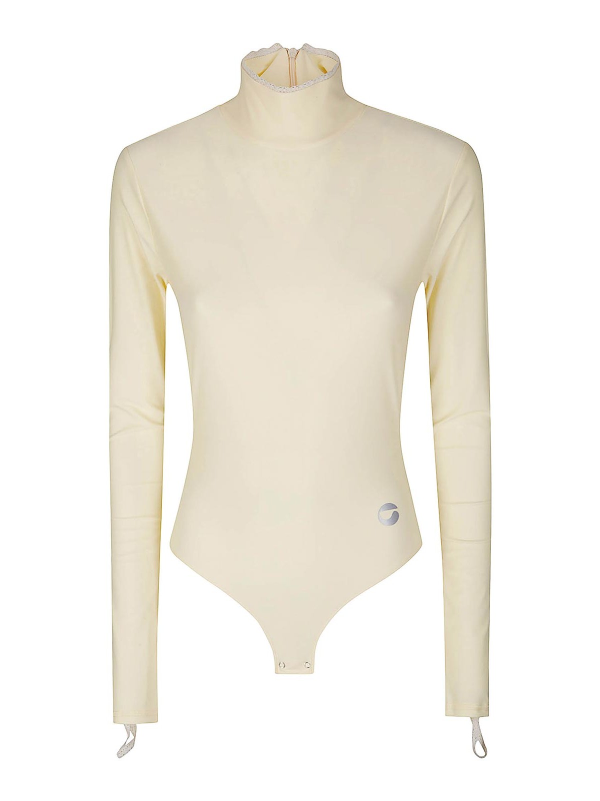 Body aus zweiter Haut mit Stehkragen und Spitze, lange Ärmel.