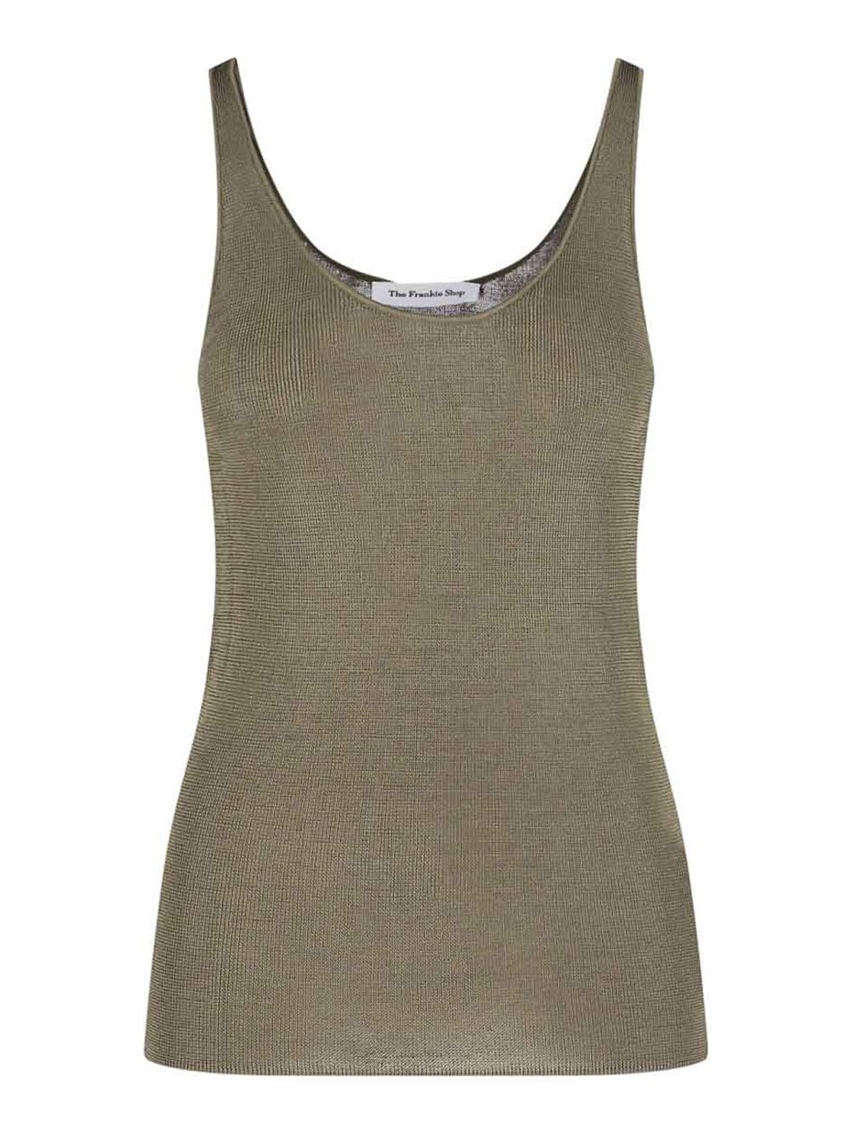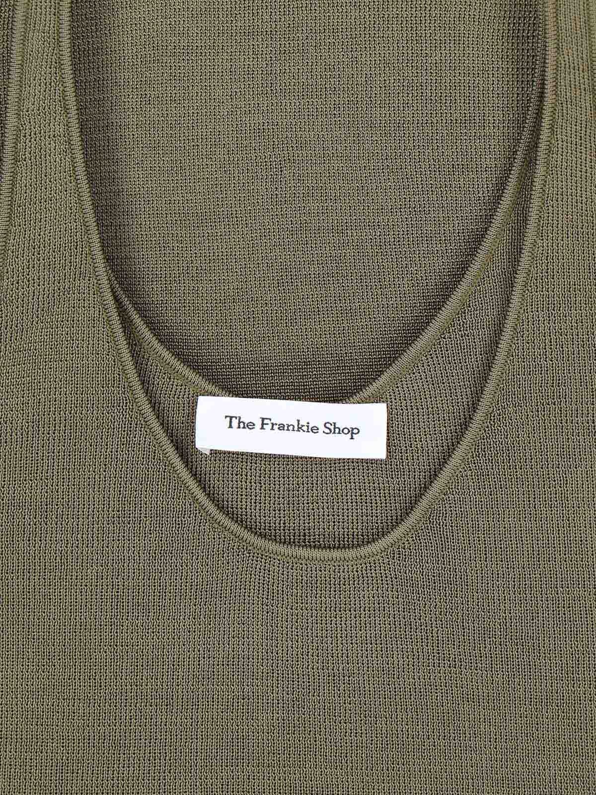 Das Frankie Shop Rivo Strick-Tanktop aus grünem Stoff, Rundhalsausschnitt, dünne Träger, tiefer Rückenausschnitt, gerader Saum.