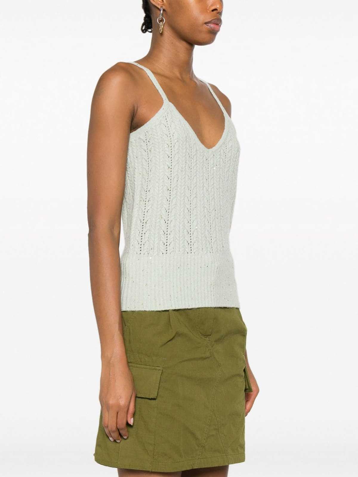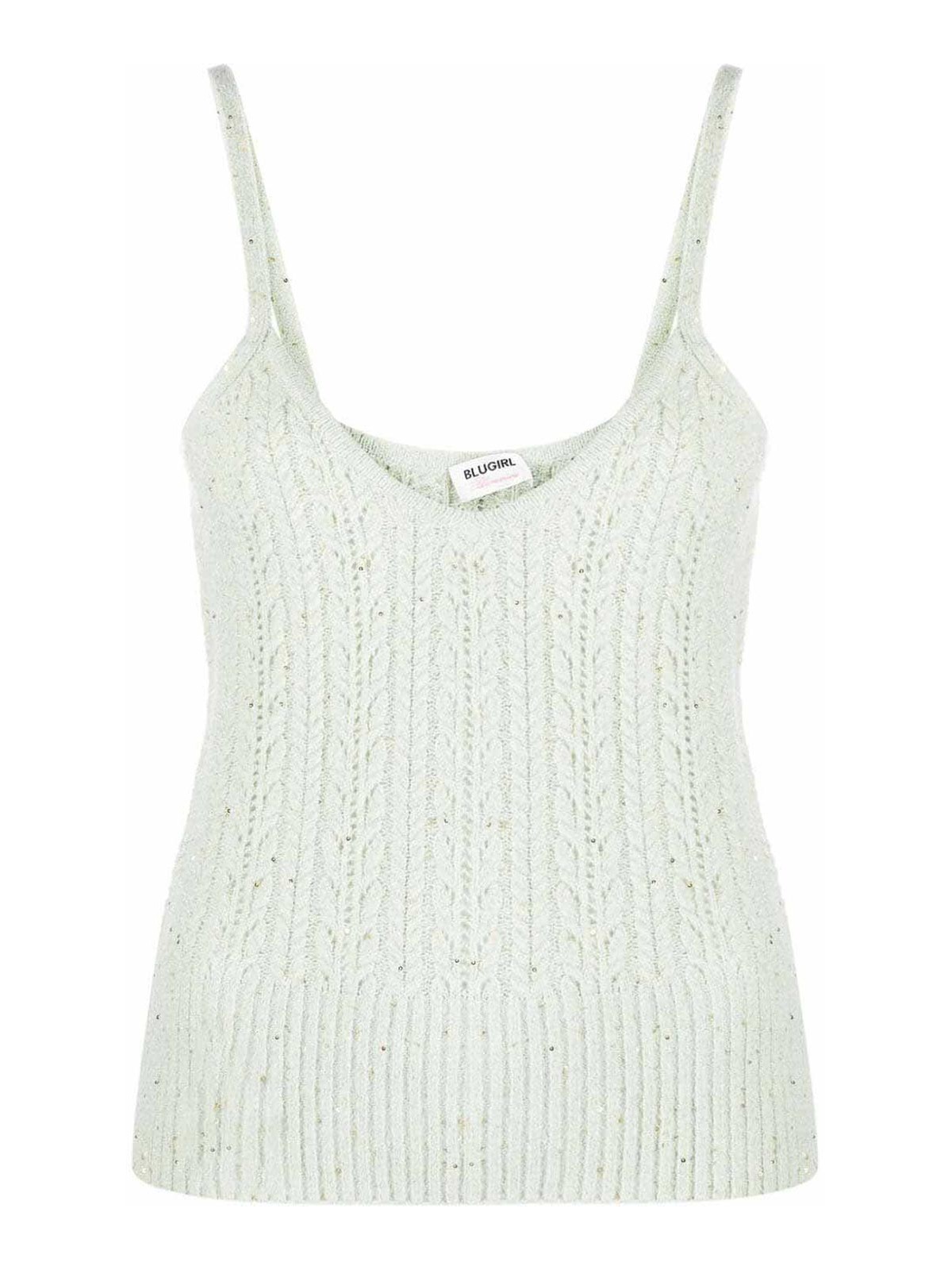 Paillettenbesetztes und gewebtes Spaghettiträger-Top der Marke Blugirl mit einer mintgrünen Strickkonstruktion, Zopfstrick, perforierter Oberfläche, Paillettenverzierung, goldener Logo-Plakette, tiefer V-Ausschnitt, Spaghettiträger und geripptem Saum