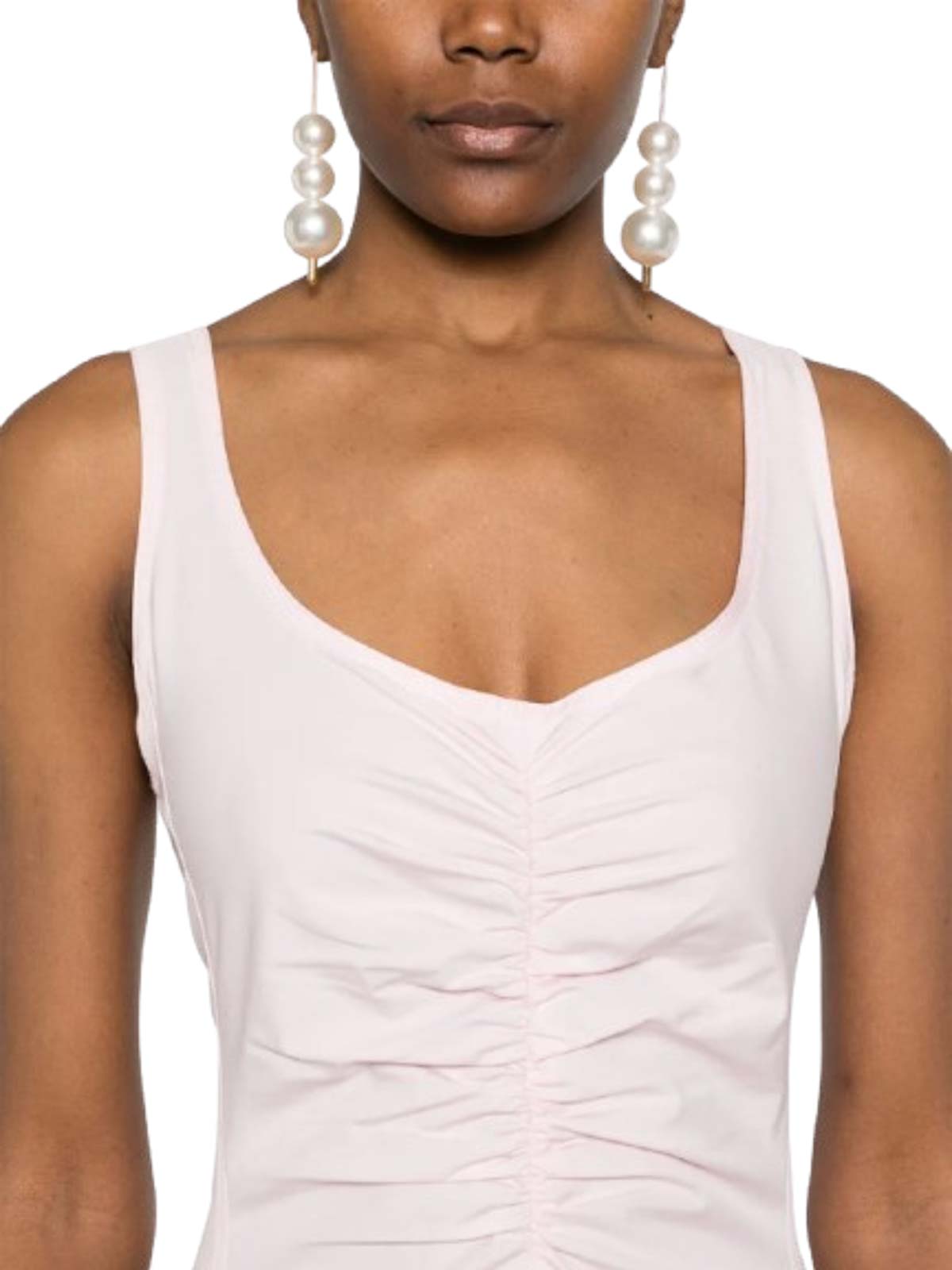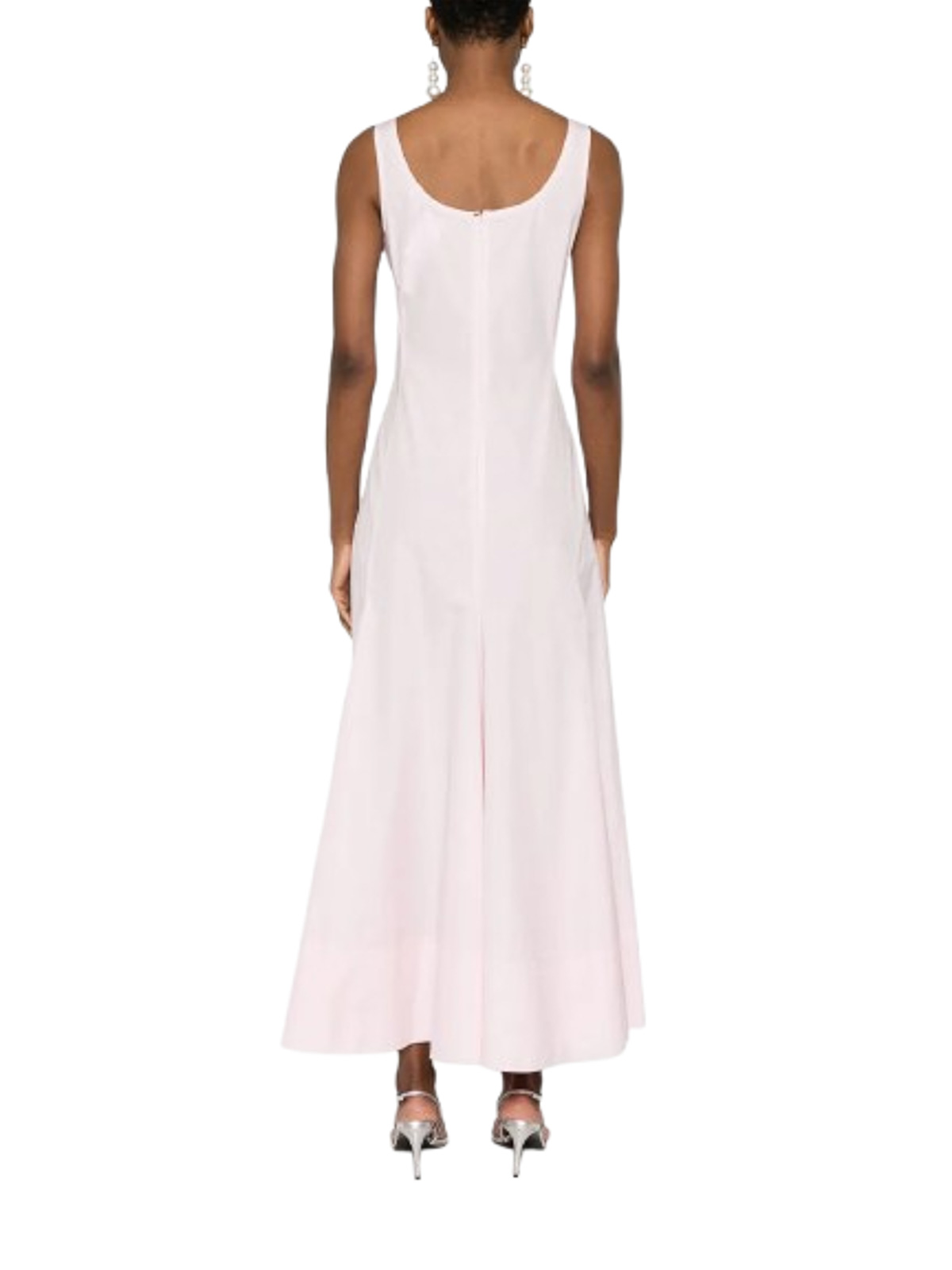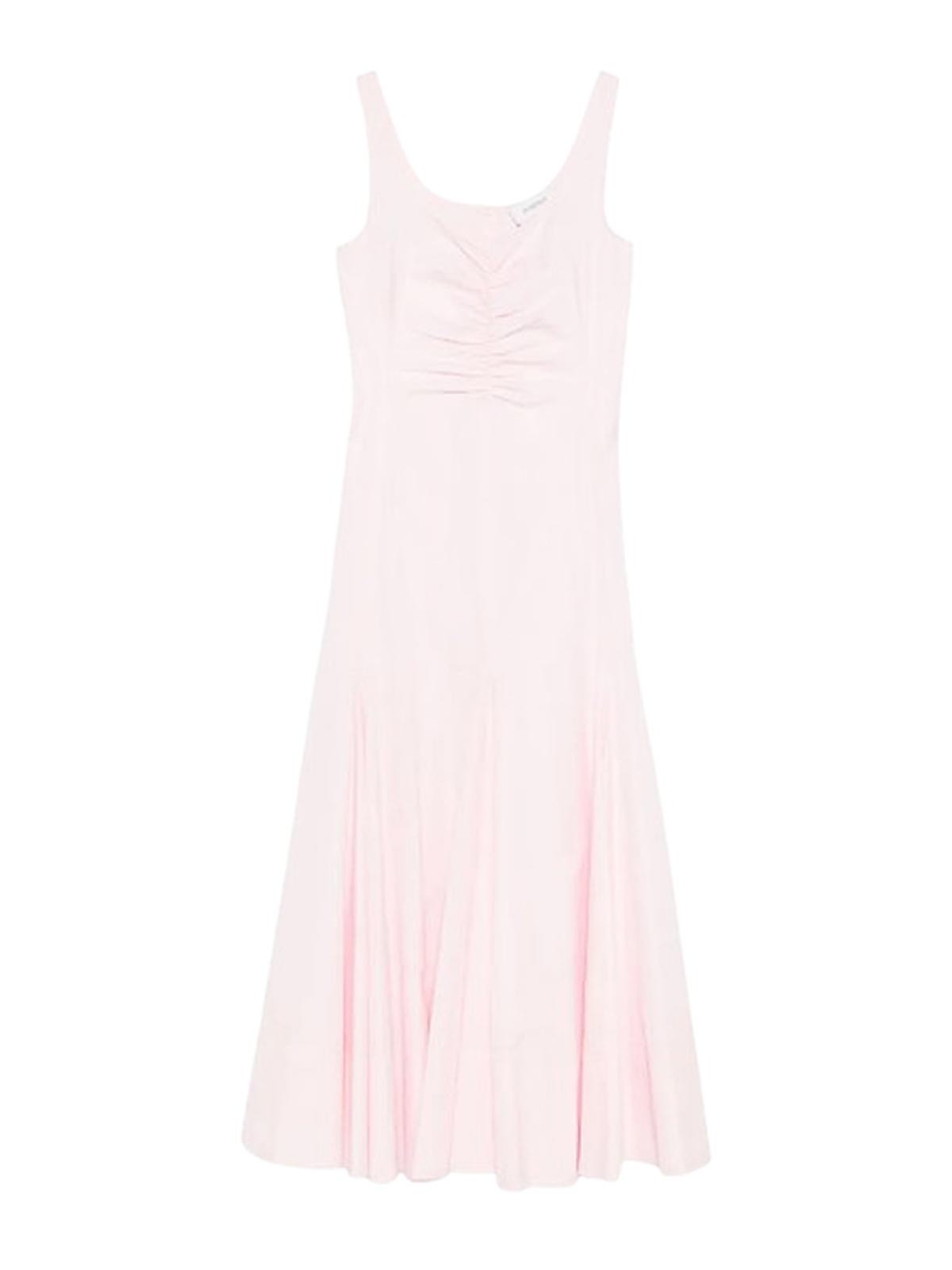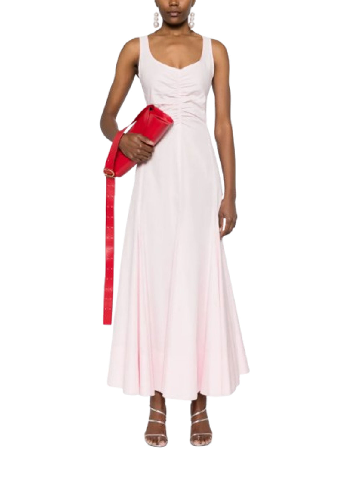 Rosafarbenes Kleid aus reiner Baumwollpopeline, Tankausschnitt und engem Oberteil mit Raffungen auf der Vorderseite. Der Rock wird an der Unterseite durch die seitlichen Schnitte breiter.