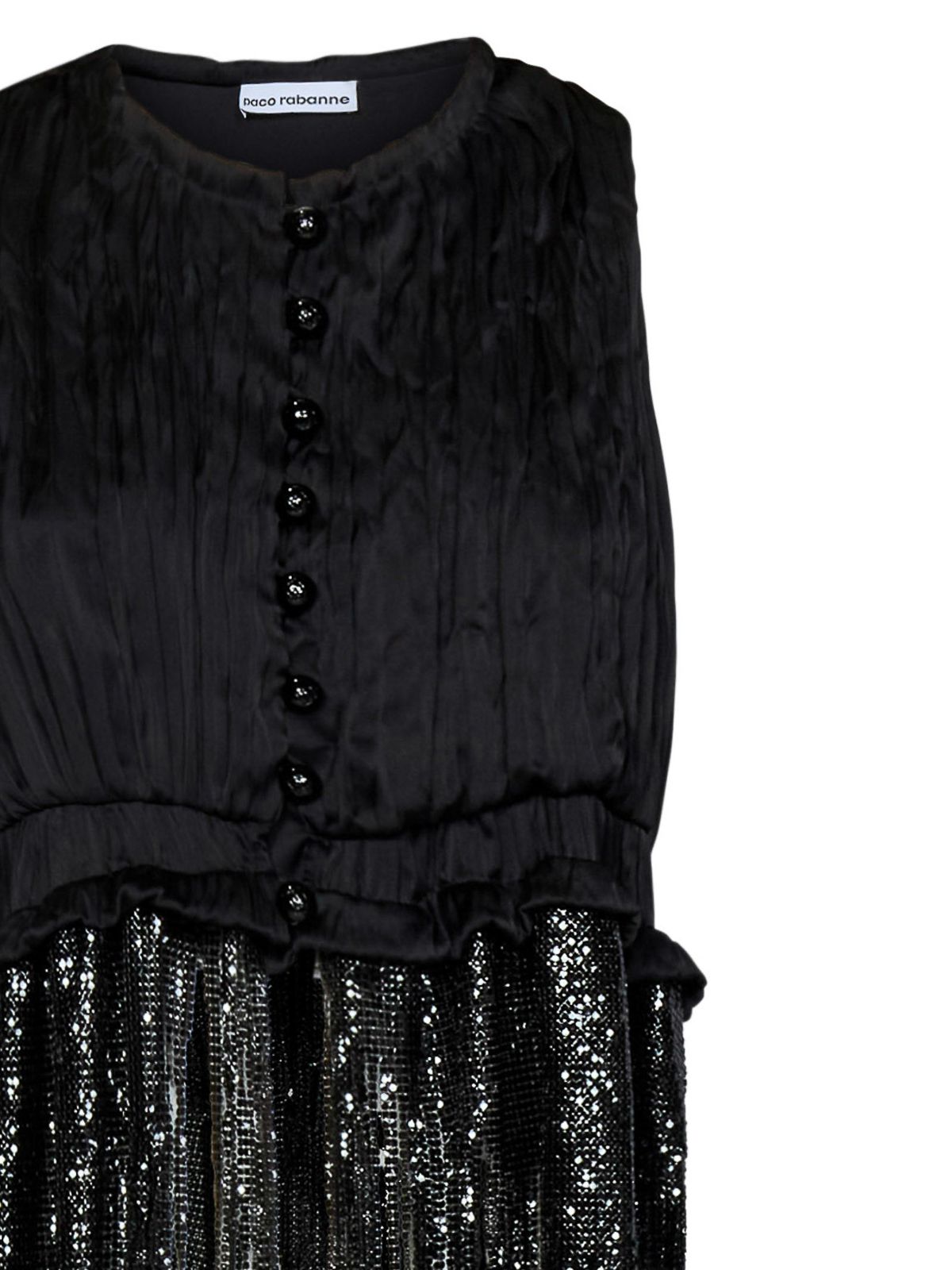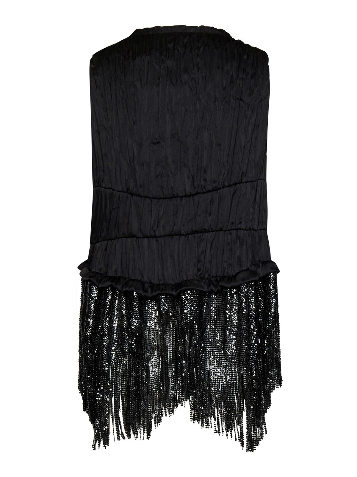 Kugelknopfverschluss auf der Vorderseite, Rundhalsausschnitt, ärmelloses, plissiertes Design, asymmetrischer Saum, schwarze Kristalle an der Unterseite, schwarze Farbe, 100% Polyester. Der Artikel auf dem Foto entspricht der Größe fr