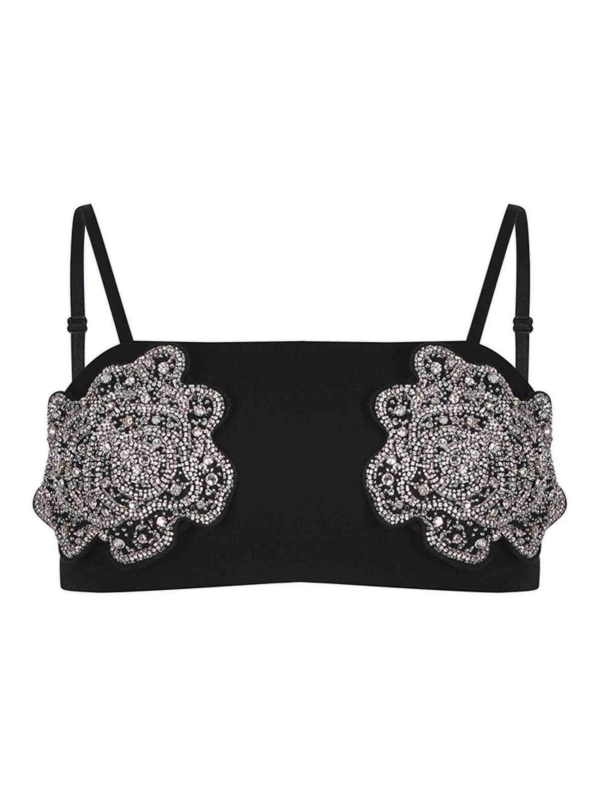 Top Pinko Barbabietole aus schwarzer Viskosemischung, gerader Ausschnitt, dünne verstellbare Träger, florale Details mit silbernen Strasssteinen auf der Brust, Rückenverschluss mit verstellbaren Haken, 98% Viskose, 2% Elastan