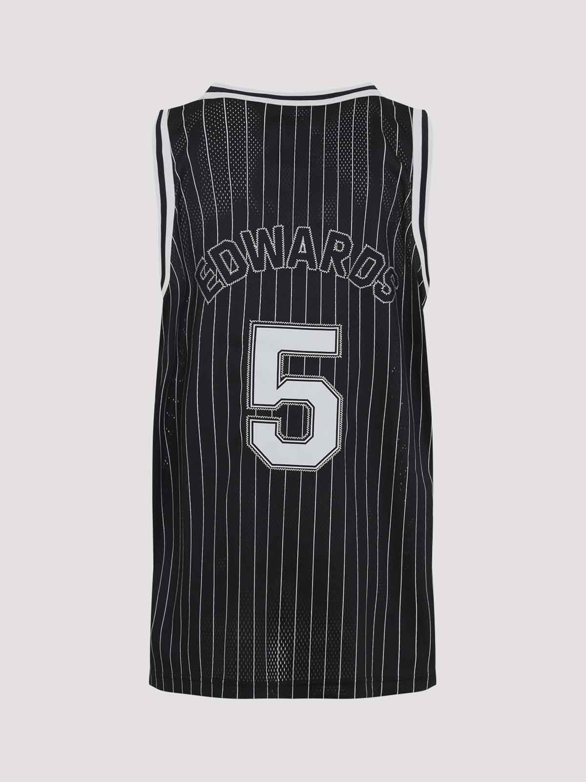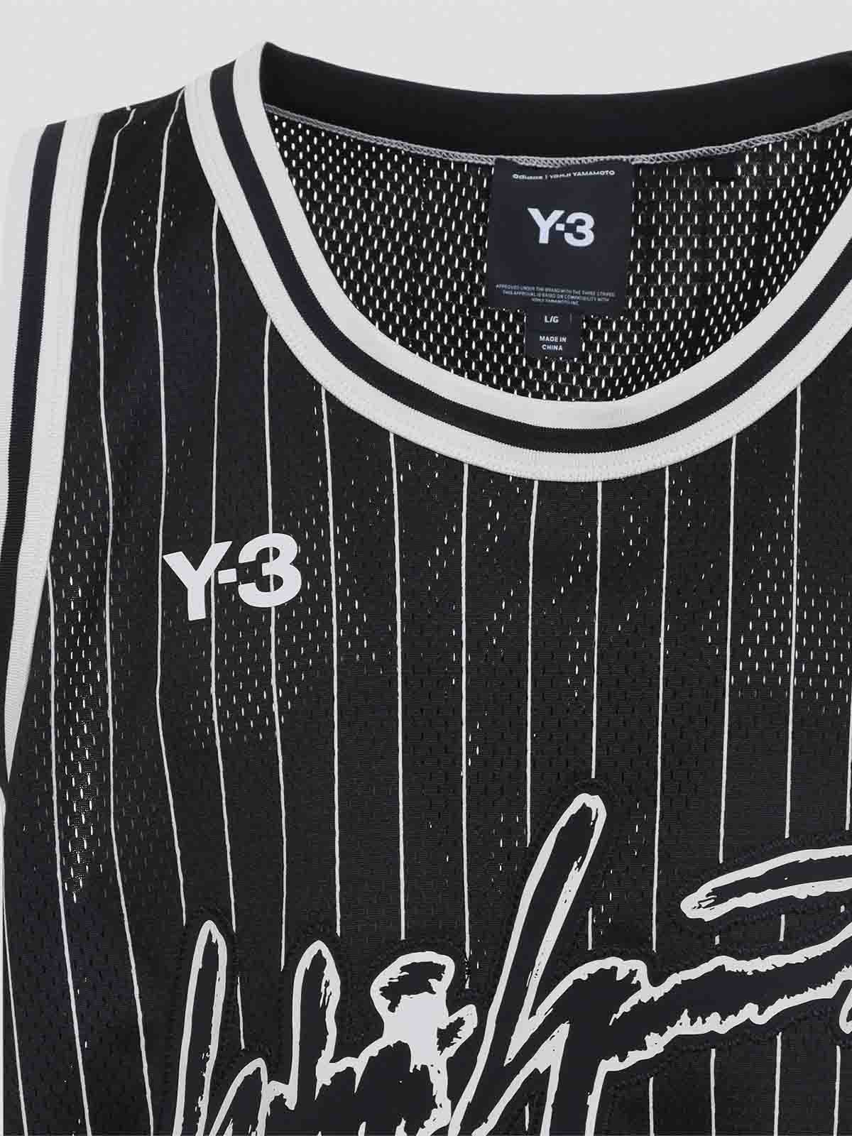 Y-3 Elite 5 Bball J schwarzes Haustier-Tanktop. Hergestellt aus schwarzem Mesh mit feinem Streifenmuster. Es zeichnet sich durch ein ärmelloses Design, einen runden Halsausschnitt, Logo- und Patch-Details, ein Markenlabel an der Vorderkante, gerippter, gestreifter Kragen und Manschetten sowie einen geraden Saum aus.