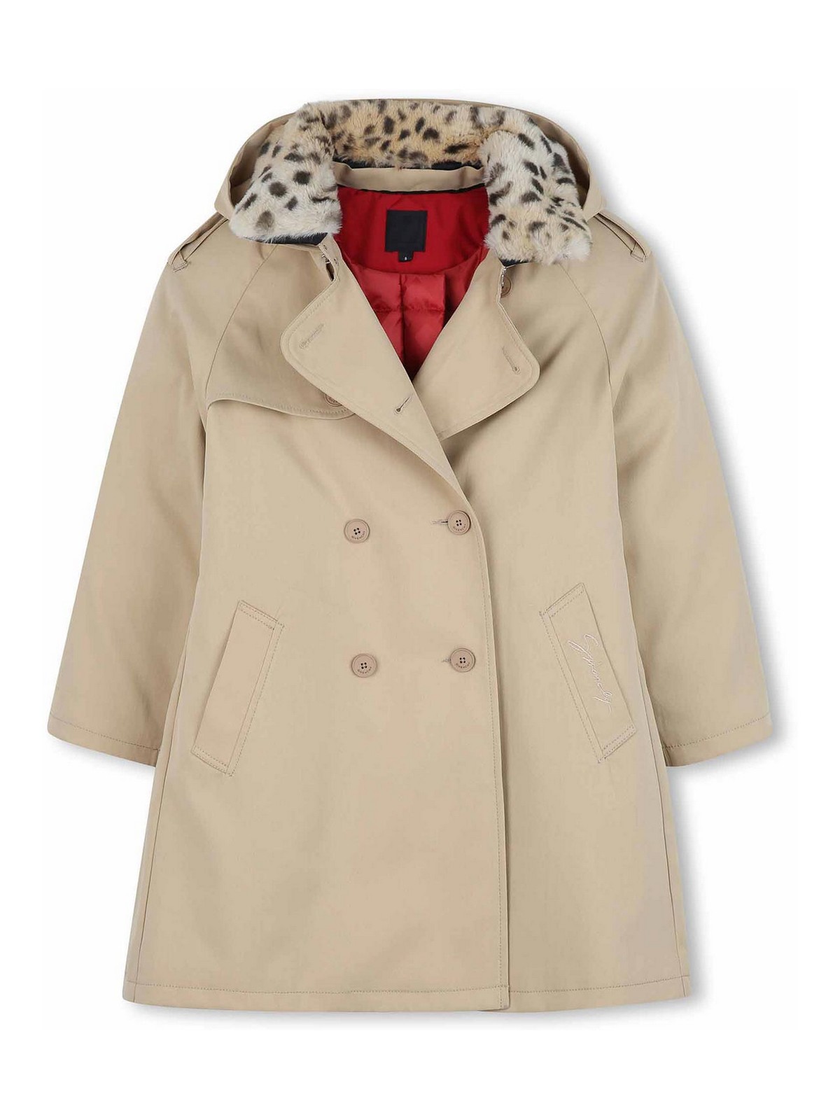 Beiger zweireihiger Trenchcoat mit Leopardenkragen und zweireihigen Gesäßfalten, Seitentaschen, abnehmbare Kapuze, herausnehmbare rote Daunenjacke mit Logo