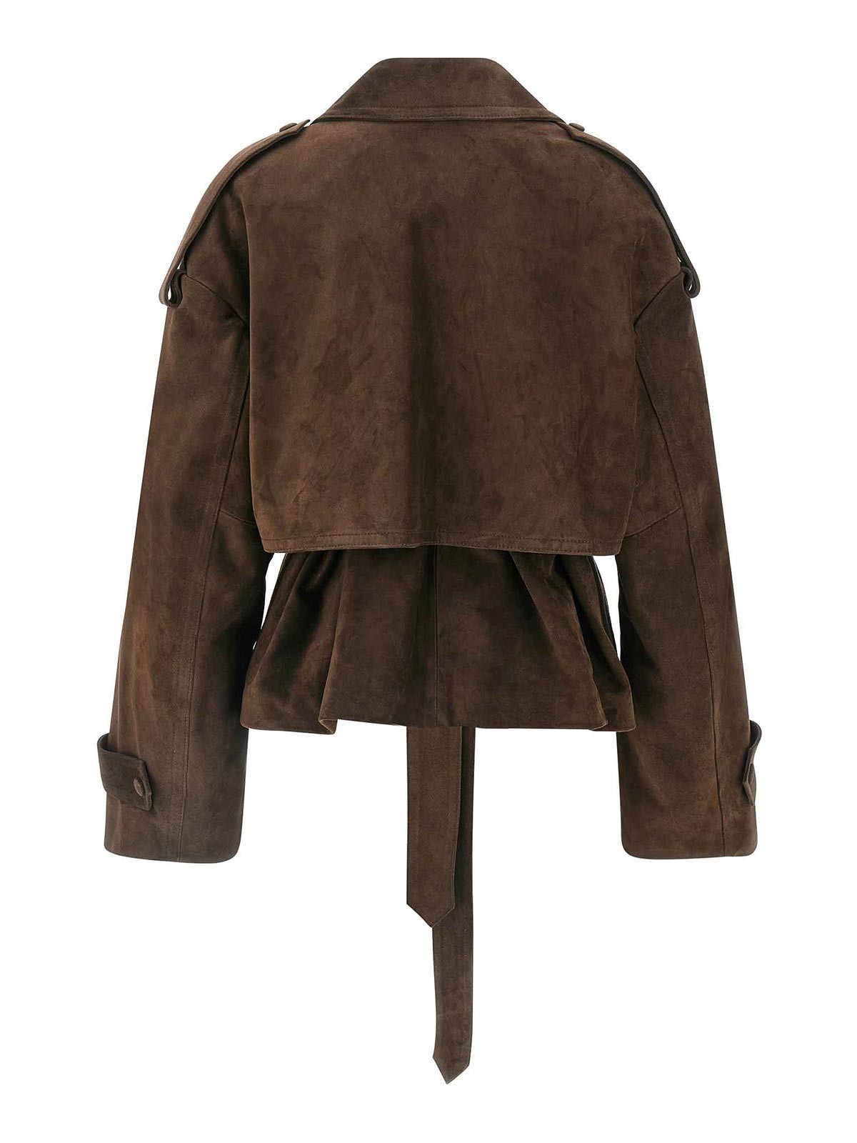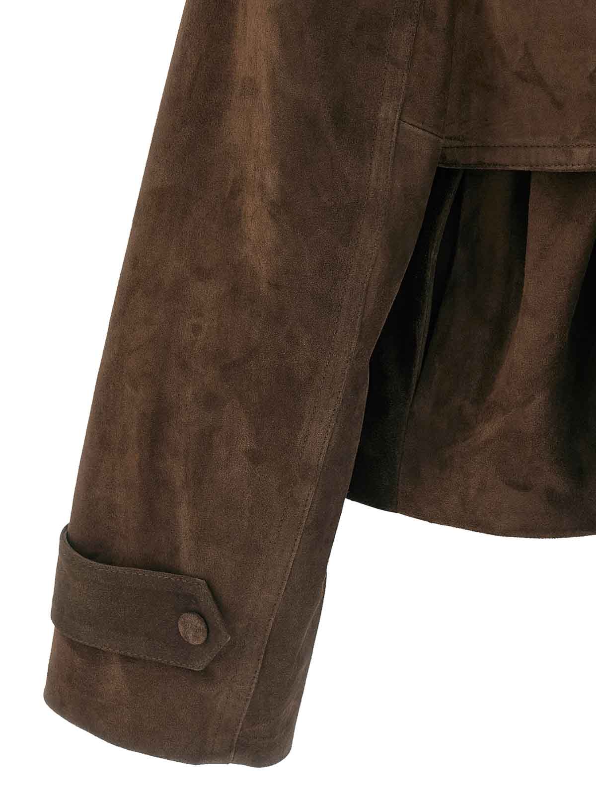 Flaminia, kurzer Trenchcoat aus Veloursleder mit Reverskragen, ausgestellter Vorderseite, Taschen, langen Ärmeln mit Flügeln, Rückencape, Futter, abnehmbarem passendem Gürtel.