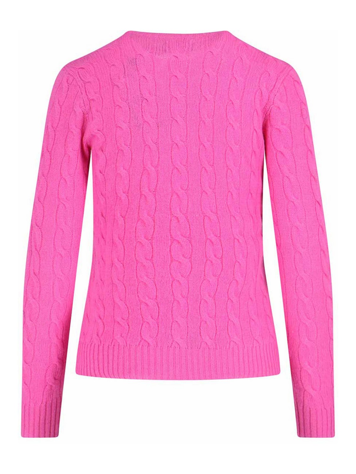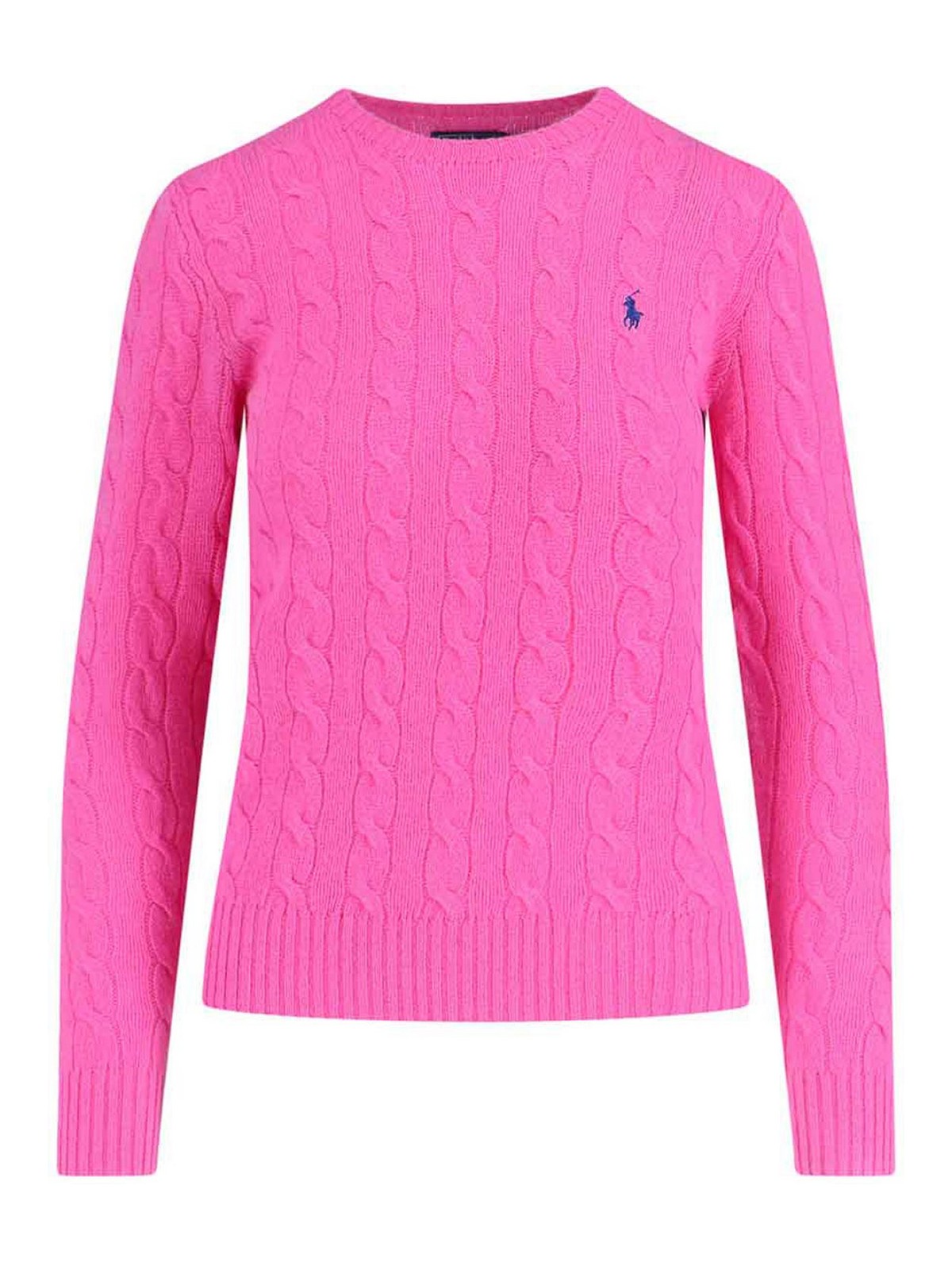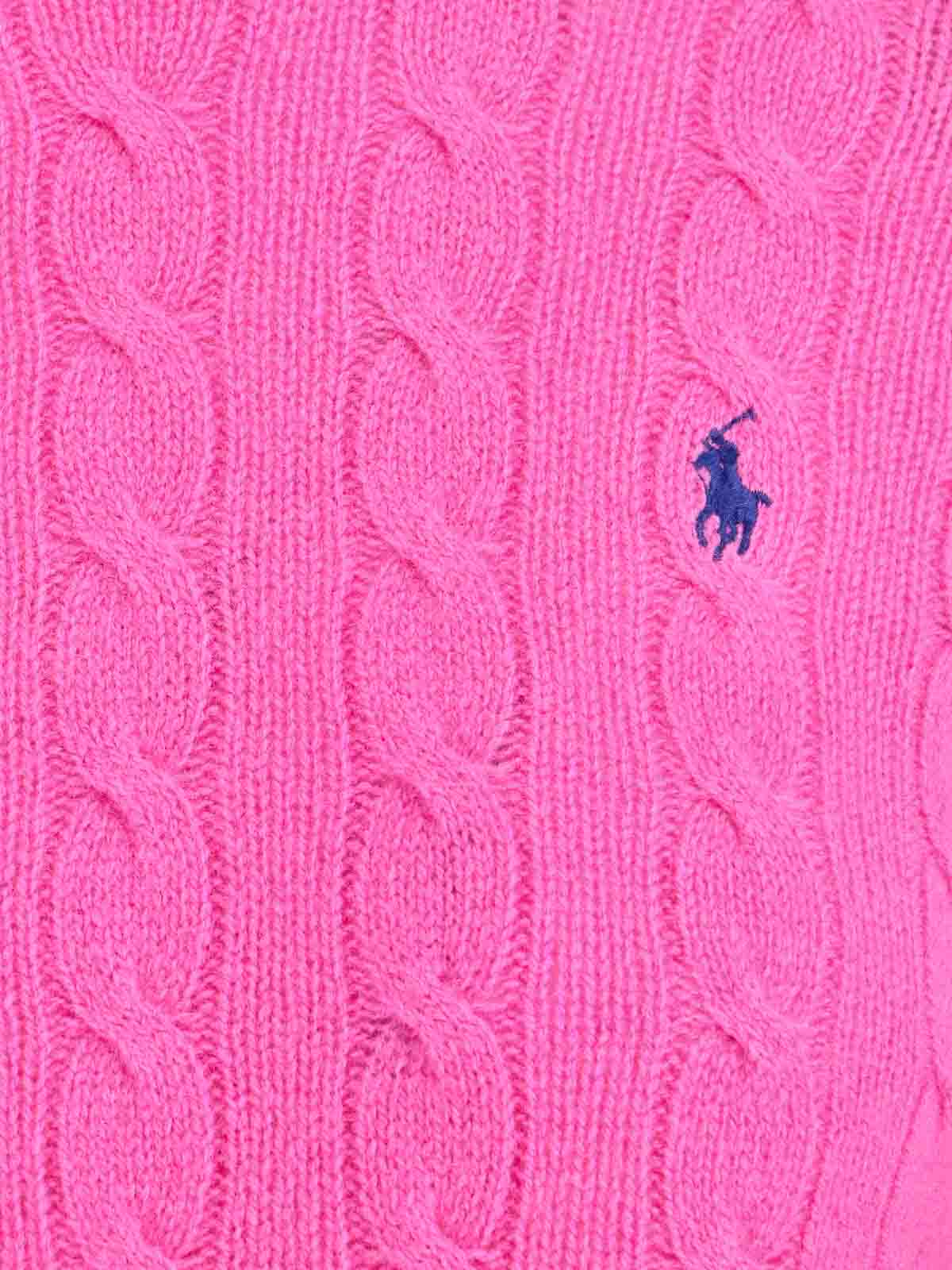 Pullover mit Zöpfen Logo Polo Ralph Lauren, aus Wolle und rosafarbenem Kaschmir, Rundhalsausschnitt, blaue Logostickerei auf der Brust, gerippte Abschlüsse, gerader Saum.