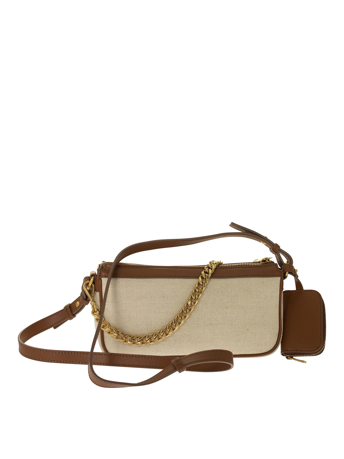 Umhängetasche aus Segeltuch mit Lederbesätzen, Logodruck, verstellbarem und abnehmbarem Schultergurt, abnehmbarem Kettengriff, Reißverschluss und Außentasche.