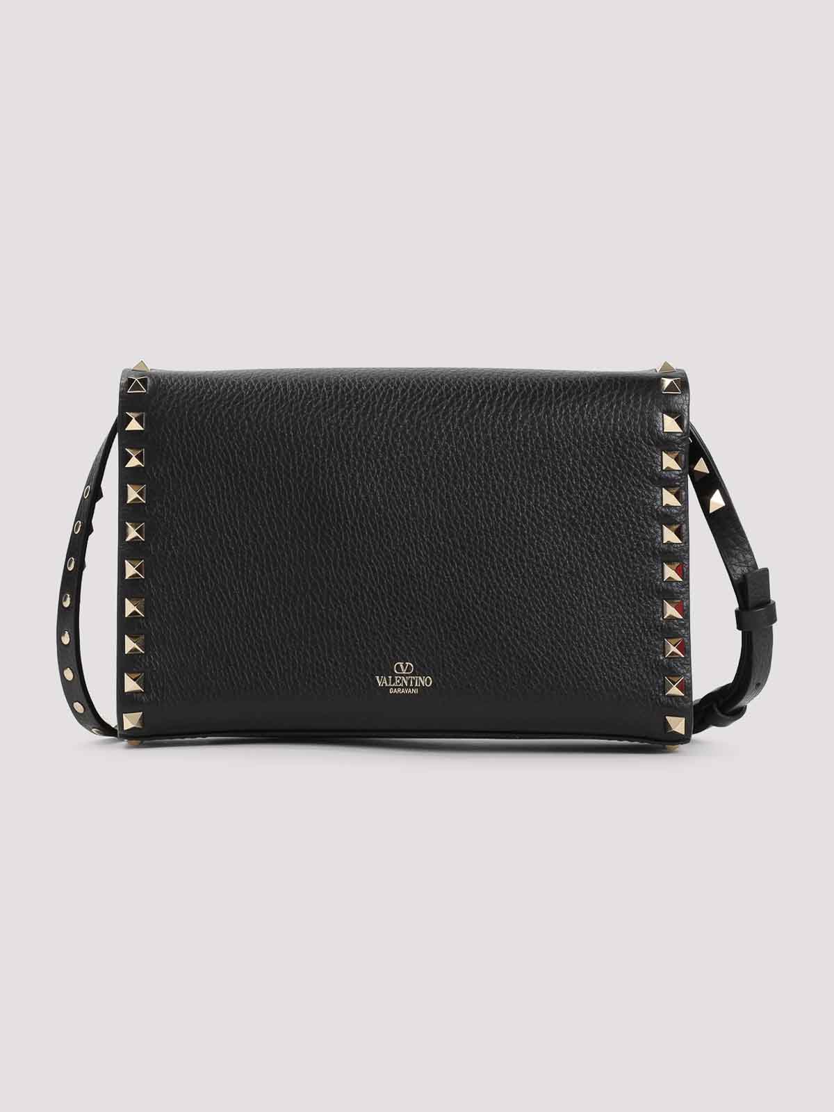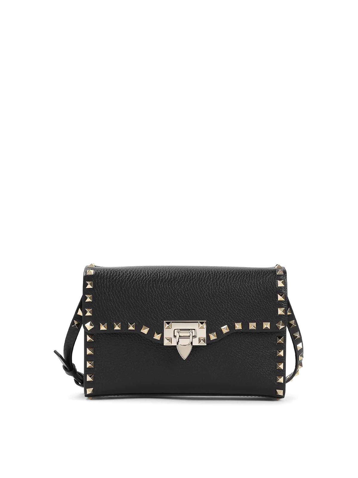 Valentino Garavani Kleine Schultertasche aus schwarzem Leder mit Rockstud. Hergestellt aus schwarzem genarbtem Leder, silberfarbene Hardware, Rockstud-Besatz, ineinandergreifender Verschluss auf der Vorderseite, geprägtes Logo auf der Rückseite, Einschubfach innen, verstellbarer Schulterriemen aus Leder, gefüttert.
