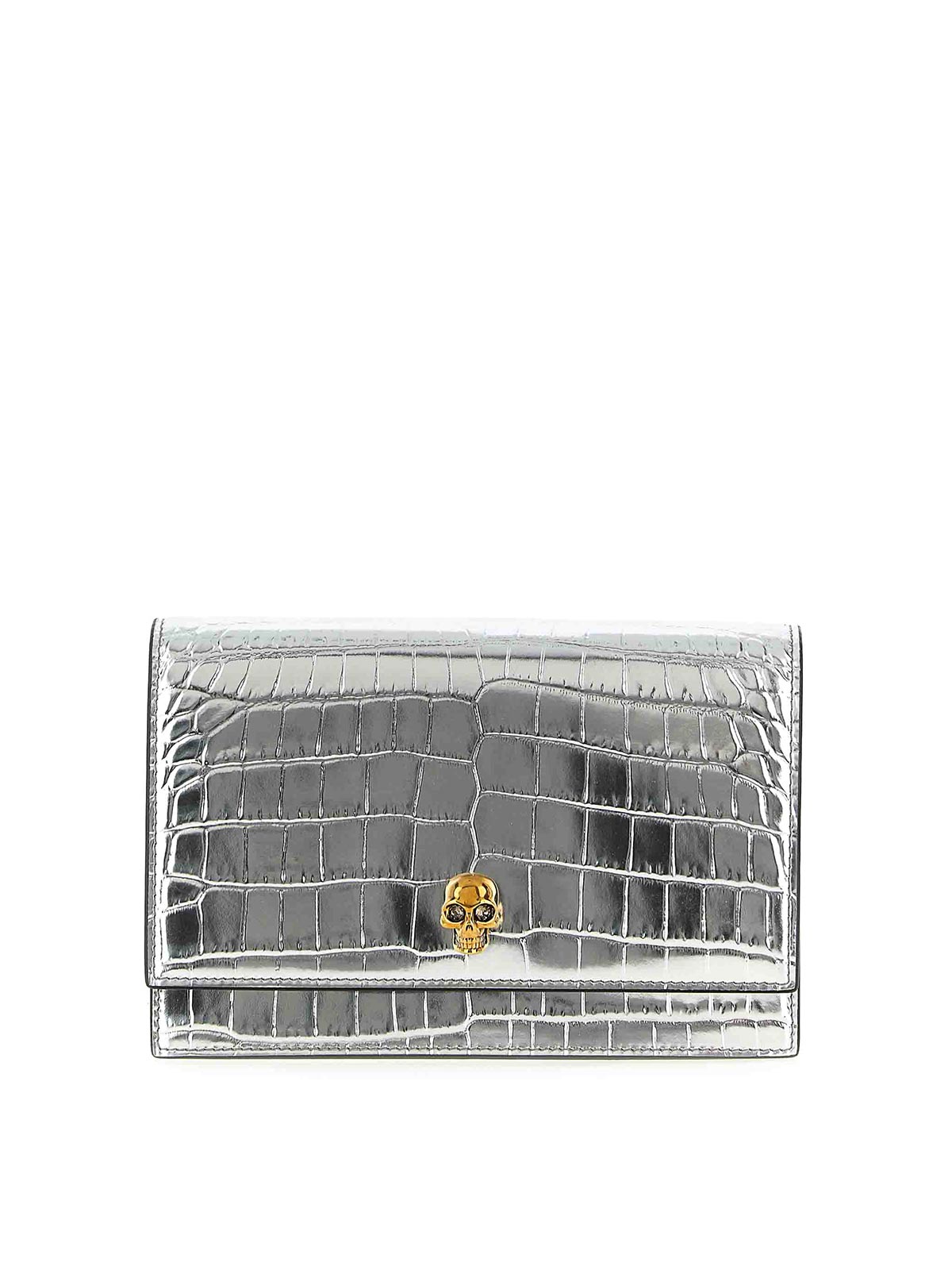 Kleine Umhängetasche aus metallischem Kalbsleder mit glänzender Oberfläche mit Prägedruck in Krokodiloptik, Magnetverschluss mit Totenkopf-Detail auf der Vorderseite und Kettenriemen in antikem Gold- und Silberfinish.