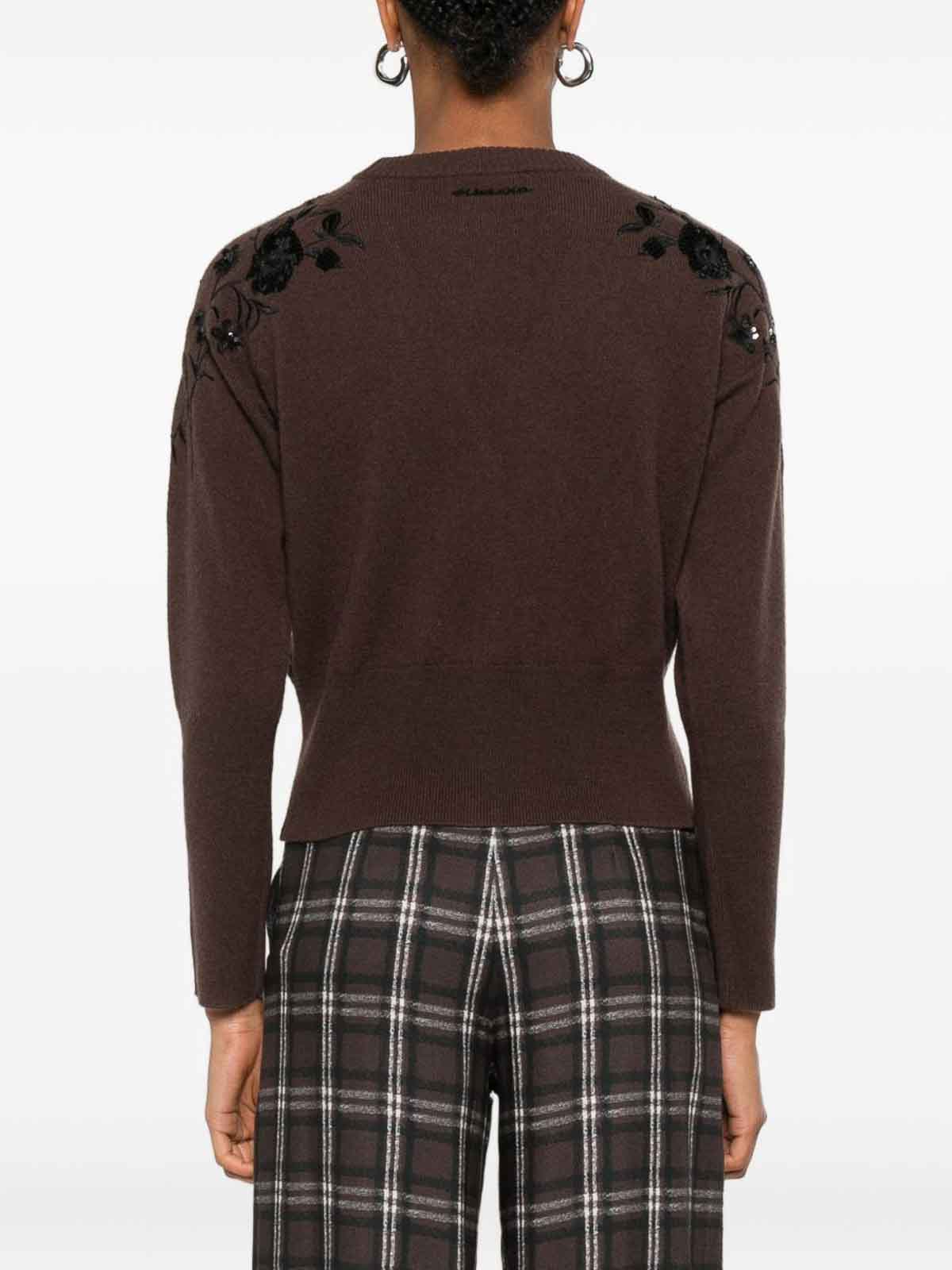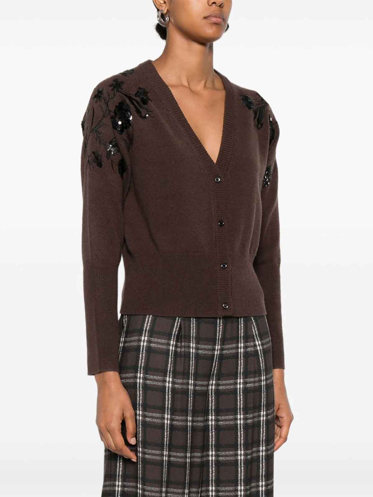 Dunkelbrauner Strickpullover mit V-Ausschnitt, Knopf und floraler Paillettenverzierung