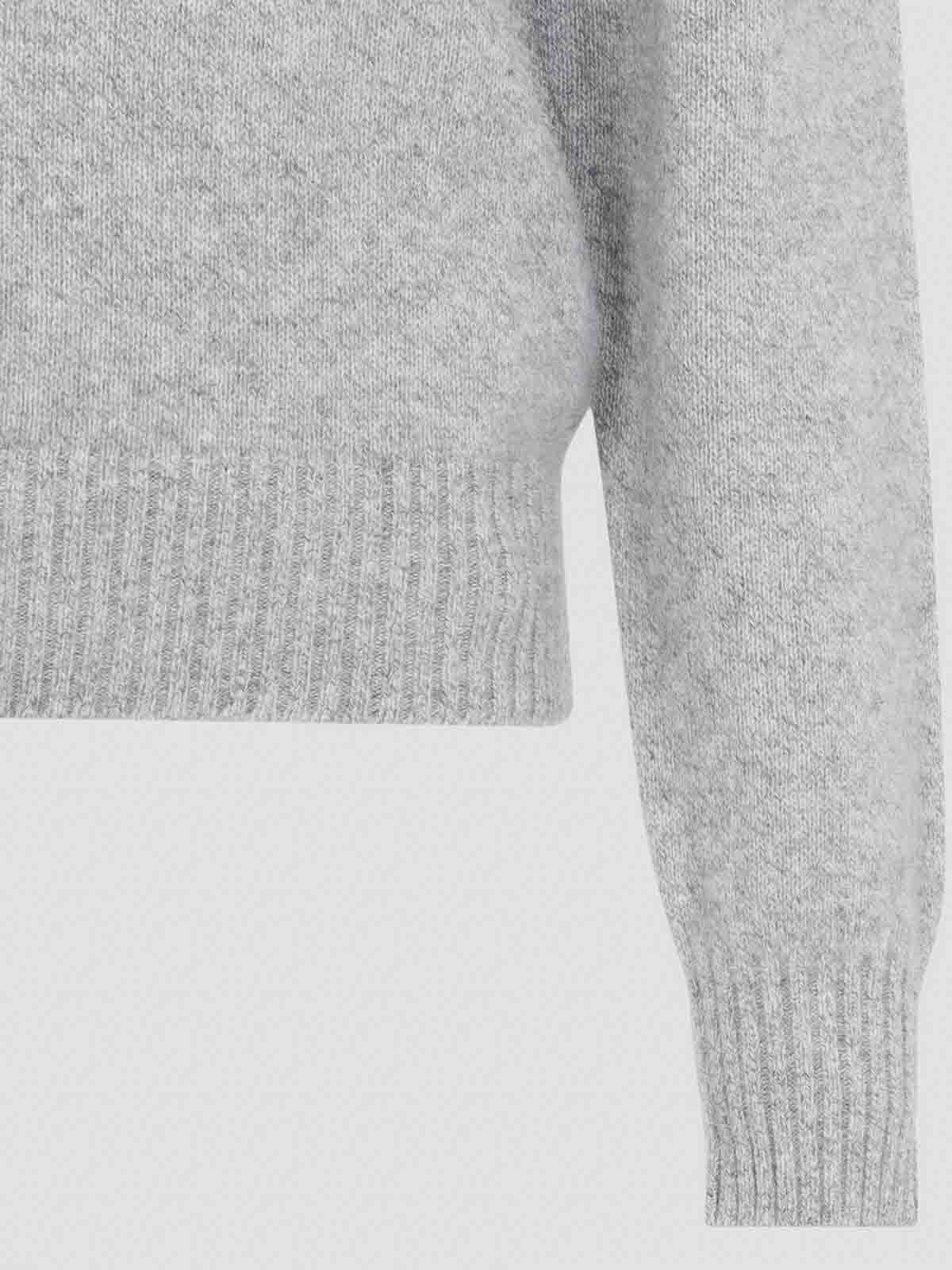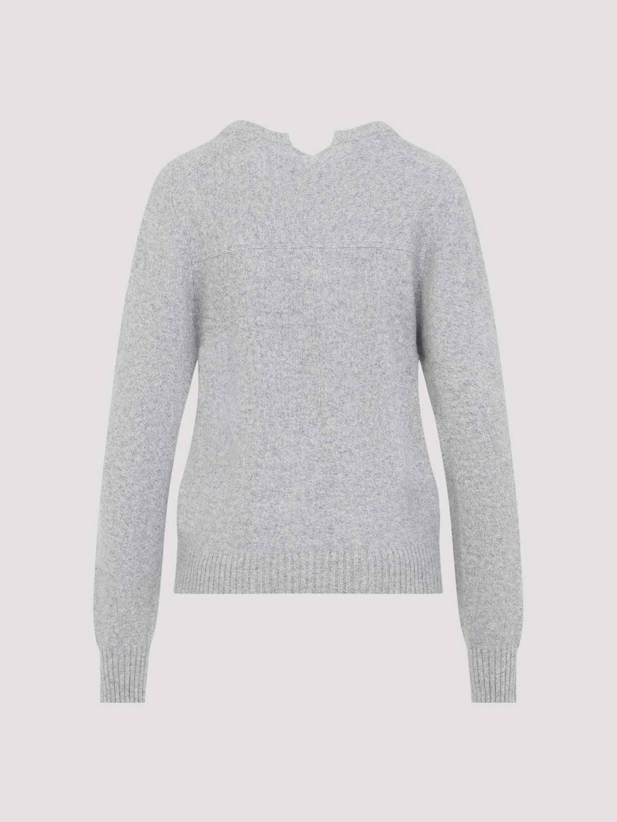 Hellgrauer Kaschmirpullover mit geschnitztem V-Ausschnitt. Hellgrauer Kaschmir in Melange, V-Ausschnitt, lange Ärmel, charakteristischer Mini-Schlitz auf der Rückseite des Kragens, gerippte Kanten, gerader Saum.