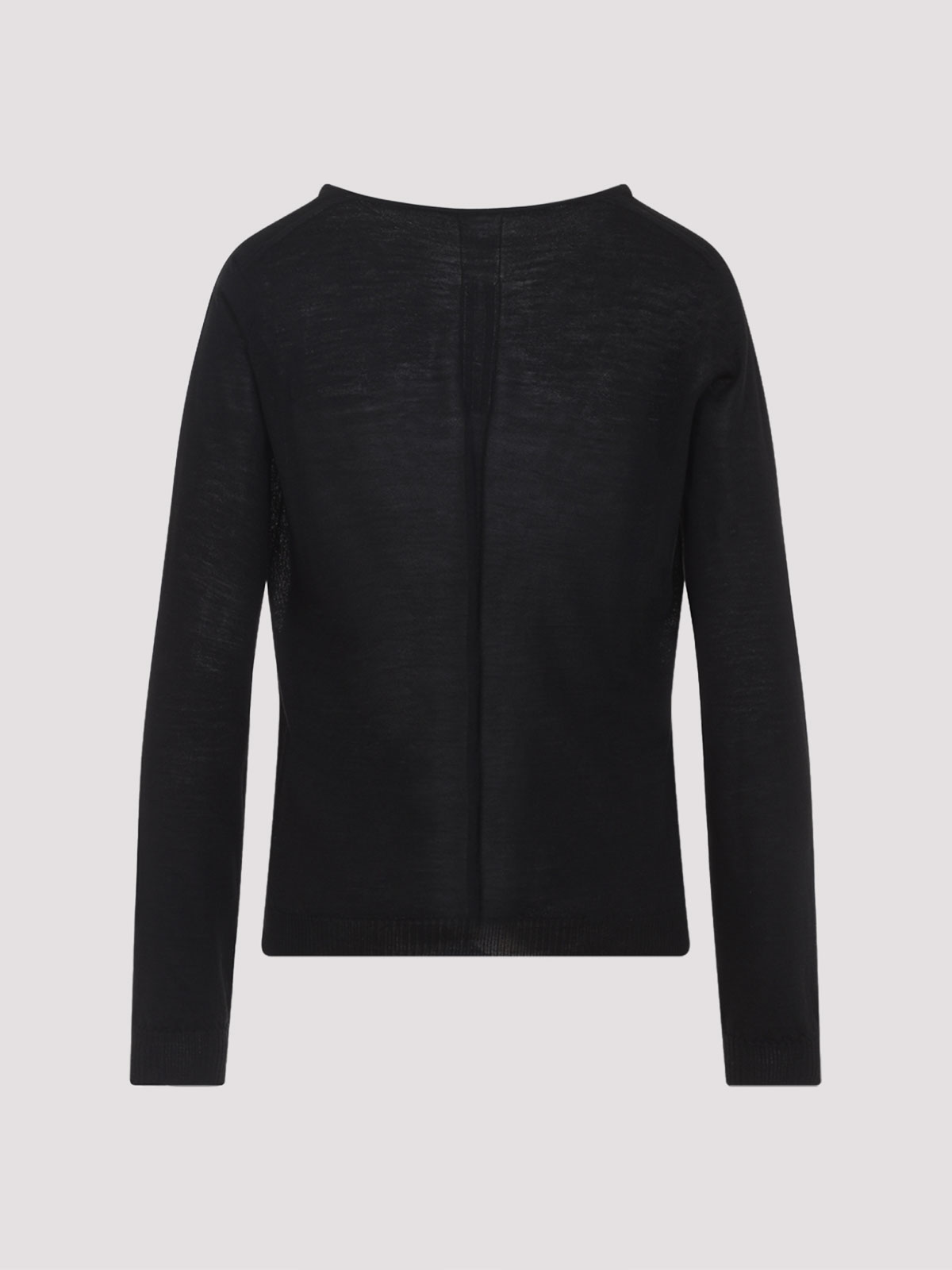 Rick Owens Pullover aus schwarzer Schurwolle mit extremem V-Ausschnitt. Hergestellt aus schwarzer Schurwolle. Er zeichnet sich durch einen tiefen V-Ausschnitt, lange Ärmel, die ikonischen Mittelsteppnähte auf der Rückseite, gerippte Kanten und einen geraden Saum aus.